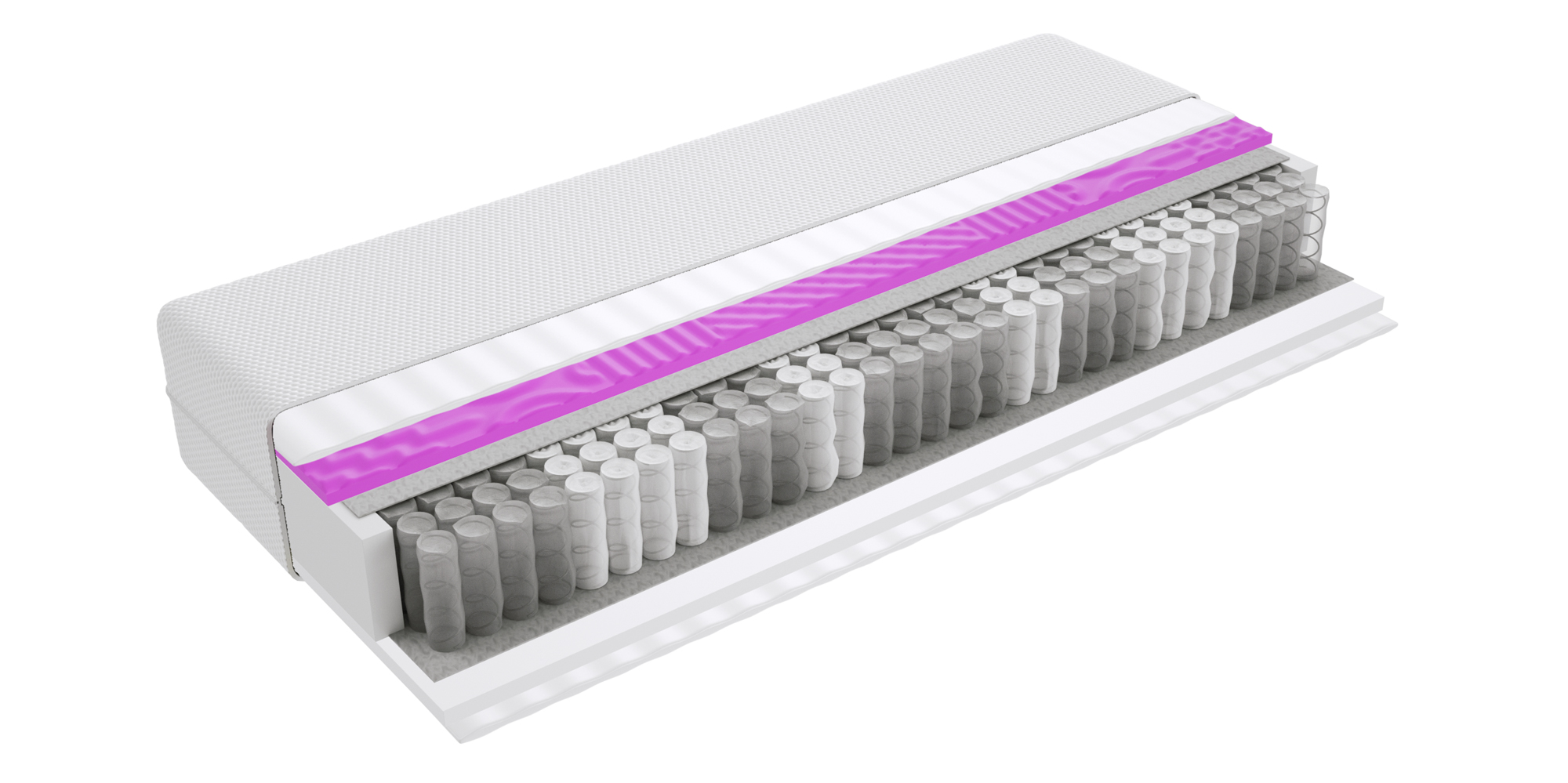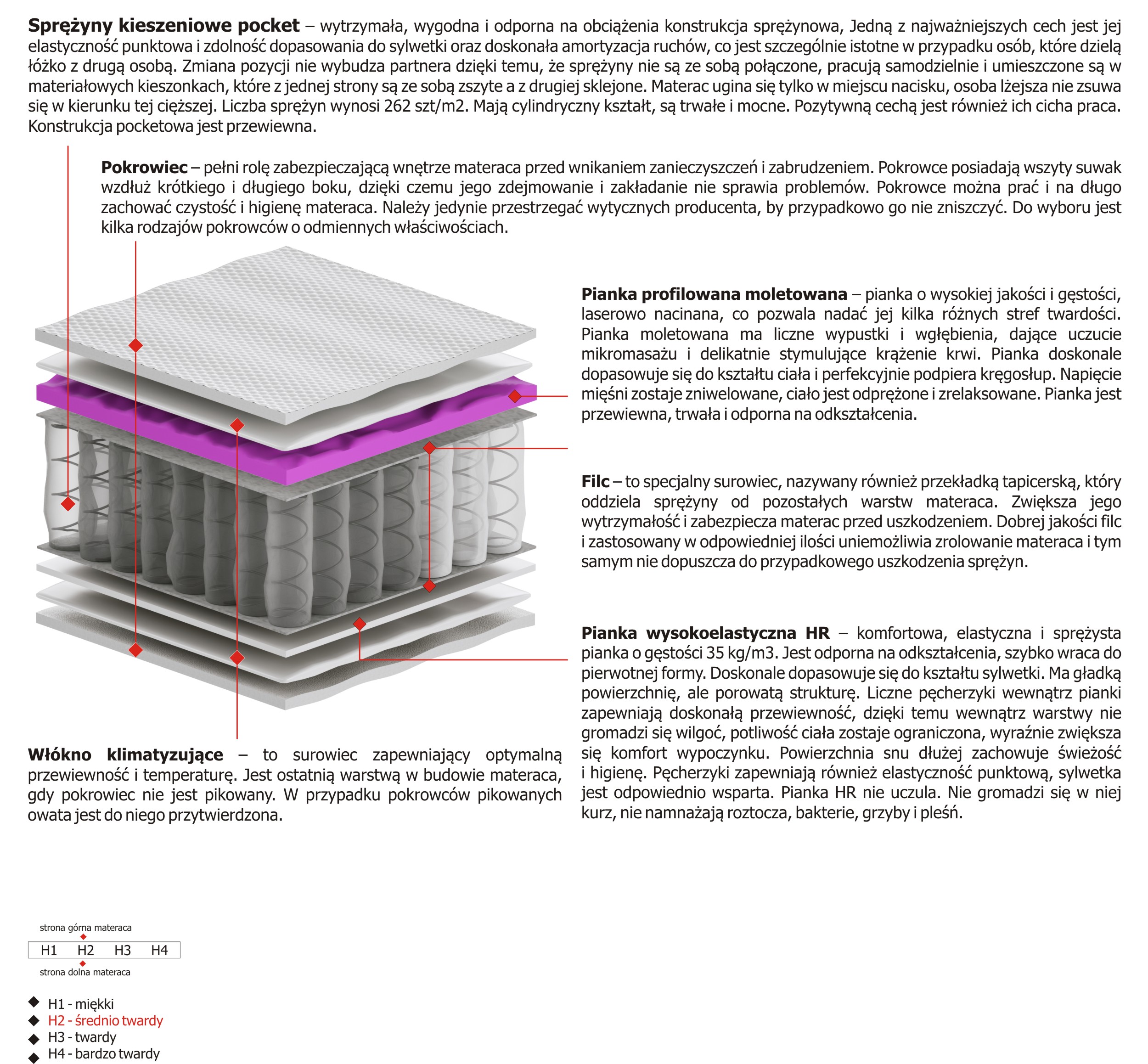 – wytrzymała, wygodna i odporna na obciążenia konstrukcja sprężynowa, Jedną z najważniejszych cech jest jej elastyczność punktowa i zdolność dopasowania do sylwetki oraz doskonała amortyzacja ruchów, co jest szczególnie istotne w przypadku osób, które dzielą łóżko z drugą osobą. Zmiana pozycji nie wybudza partnera dzięki temu, że sprężyny nie są ze sobą połączone, pracują samodzielnie i umieszczone są w materiałowych kieszonkach, które z jednej strony są ze sobą zszyte a z drugiej sklejone. Materac ugina się tylko w miejscu nacisku, osoba lżejsza nie zsuwa się w kierunku tej cięższej. Liczba sprężyn wynosi 262 szt/m2. Mają cylindryczny kształt, są trwałe i mocne. Pozytywną cechą jest również ich cicha praca. Konstrukcja pocketowa jest przewiewna.