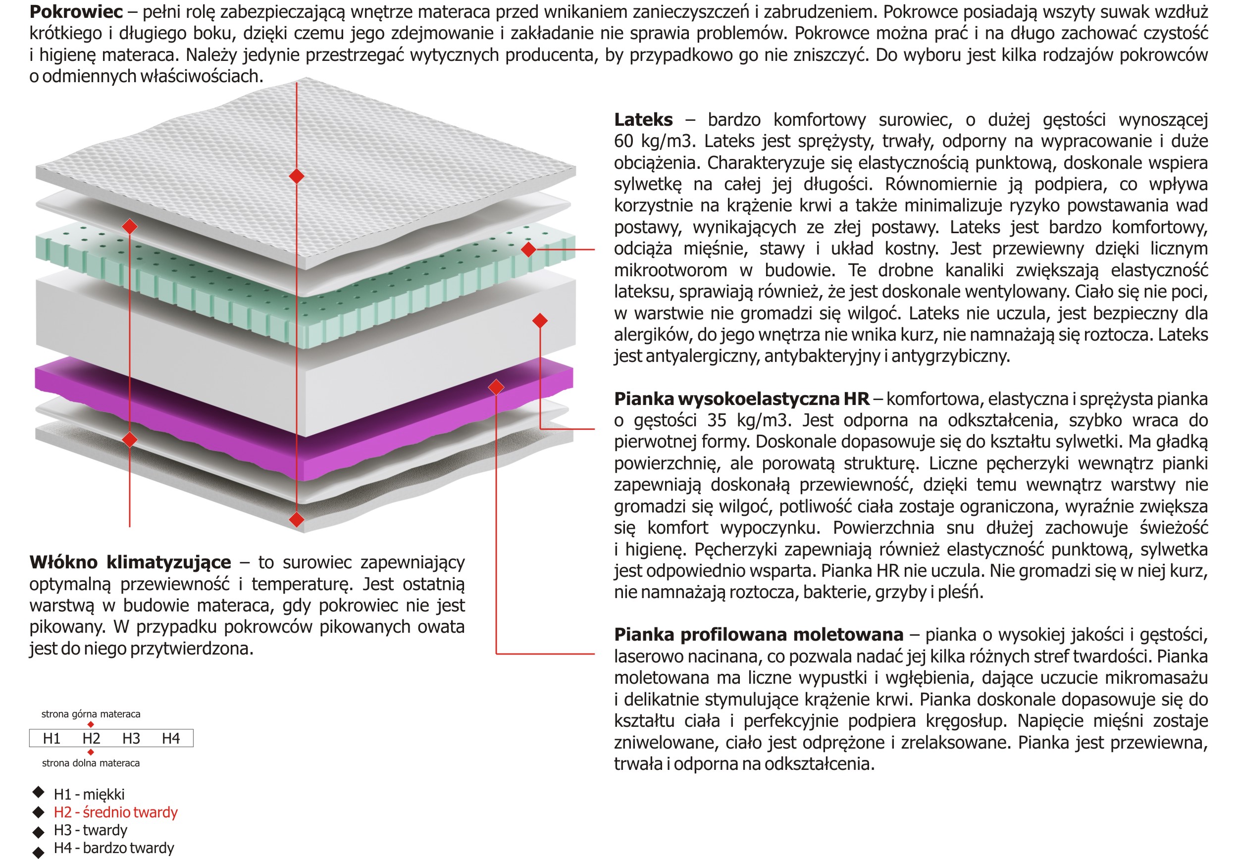 – komfortowa, elastyczna i sprężysta pianka o gęstości 35 kg/m3. Jest odporna na odkształcenia, szybko wraca do pierwotnej formy. Doskonale dopasowuje się do kształtu sylwetki. Ma gładką powierzchnię, ale porowatą strukturę. Liczne pęcherzyki wewnątrz pianki zapewniają doskonałą przewiewność, dzięki temu wewnątrz warstwy nie gromadzi się wilgoć, potliwość ciała zostaje ograniczona, wyraźnie zwiększa się komfort wypoczynku. Powierzchnia snu dłużej zachowuje świeżość i higienę. Pęcherzyki zapewniają również elastyczność punktową, sylwetka jest odpowiednio wsparta. Pianka HR nie uczula. Nie gromadzi się w niej kurz, nie namnażają roztocza, bakterie, grzyby i pleśń.