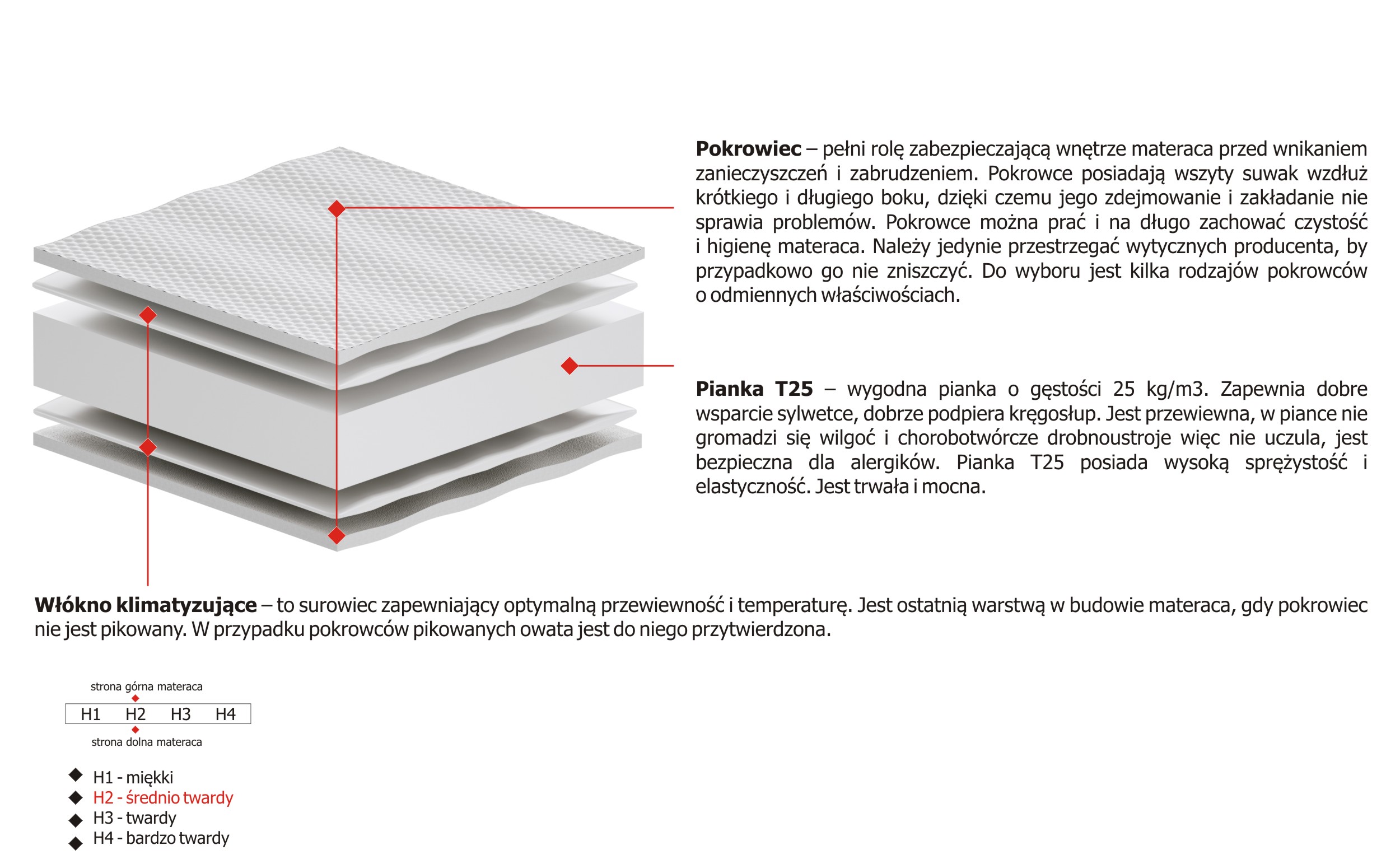 – wygodna pianka o gęstości 25 kg/m3. Zapewnia dobre wsparcie sylwetce, dobrze podpiera kręgosłup. Jest przewiewna, w piance nie gromadzi się wilgoć i chorobotwórcze drobnoustroje więc nie uczula, jest bezpieczna dla alergików. Pianka T25 posiada wysoką sprężystość i elastyczność. Jest trwała i mocna.