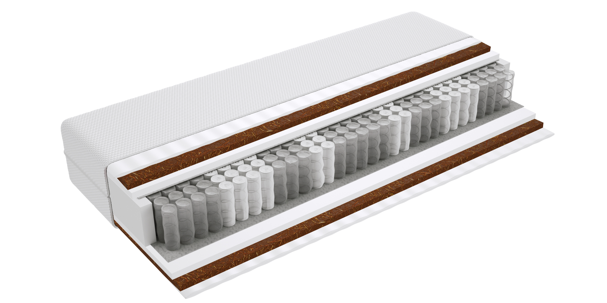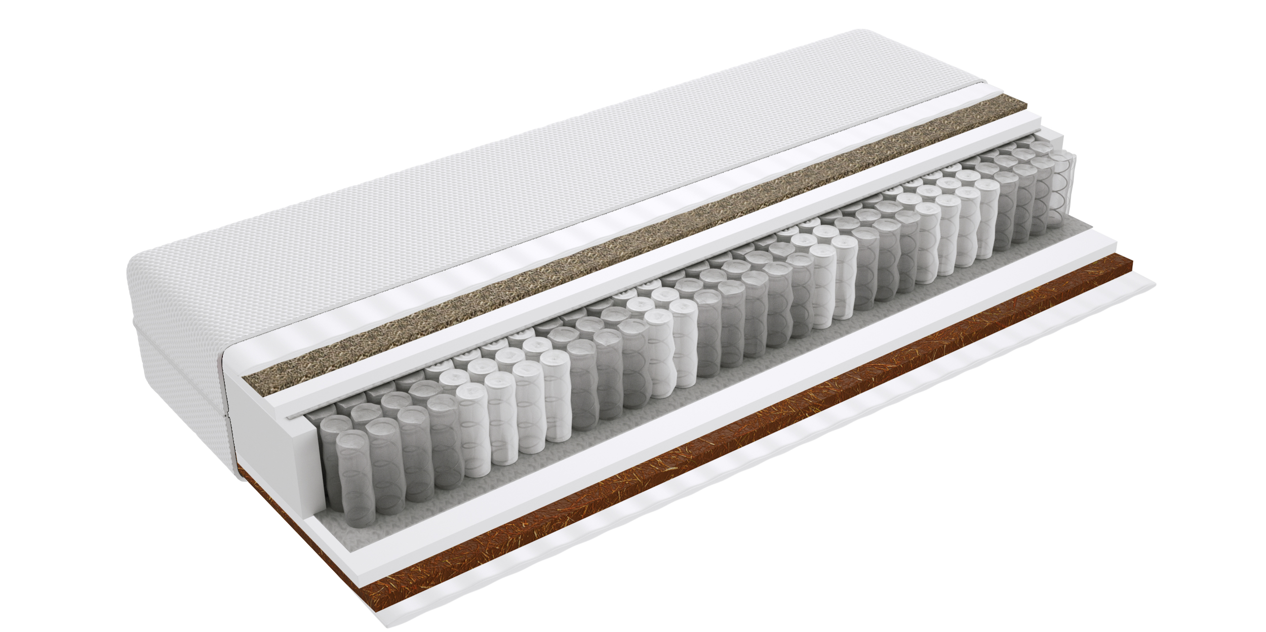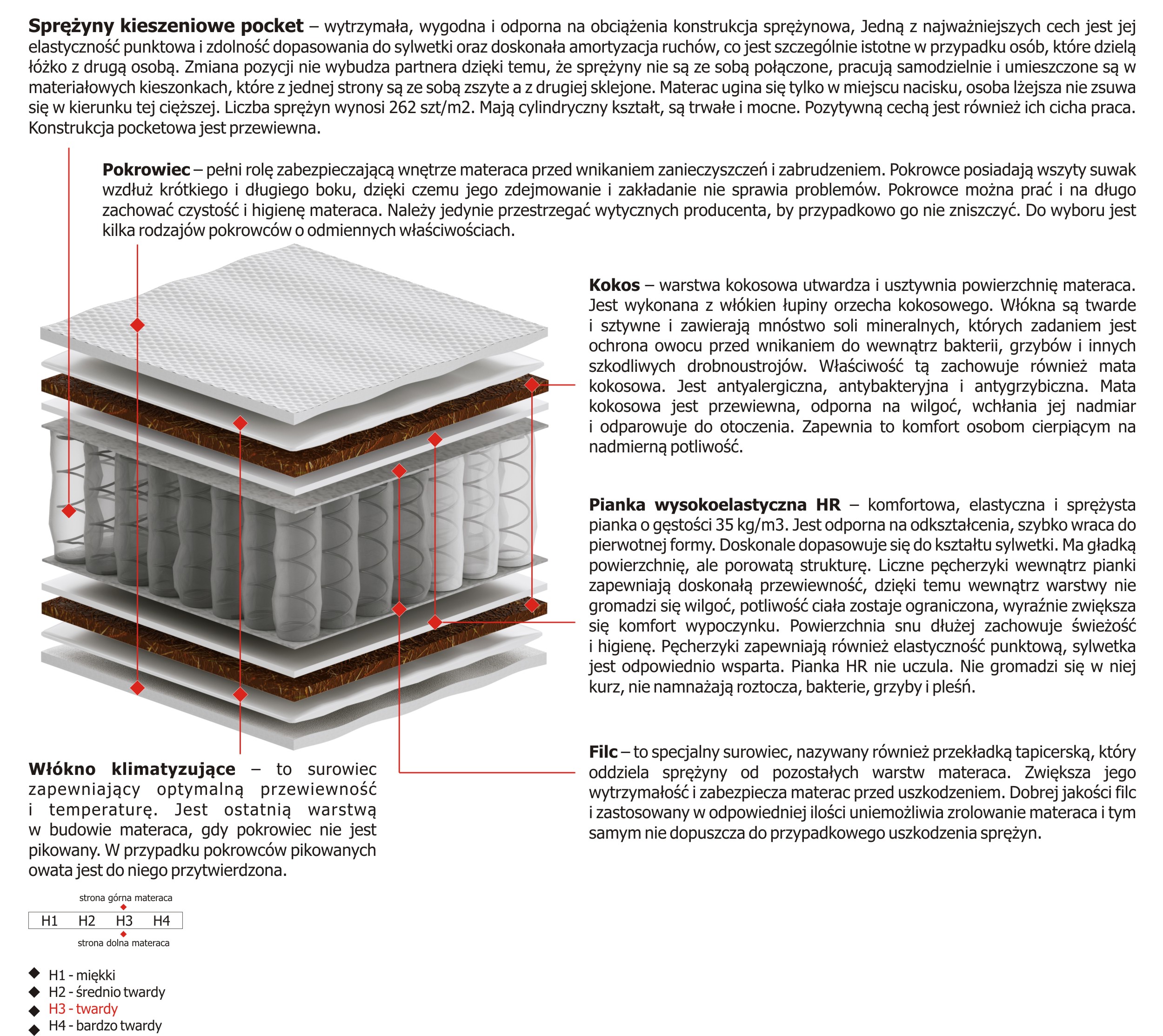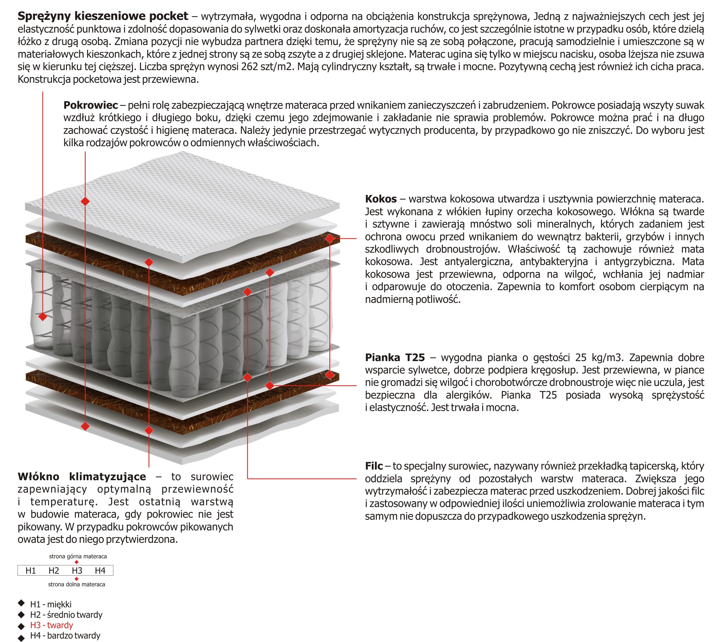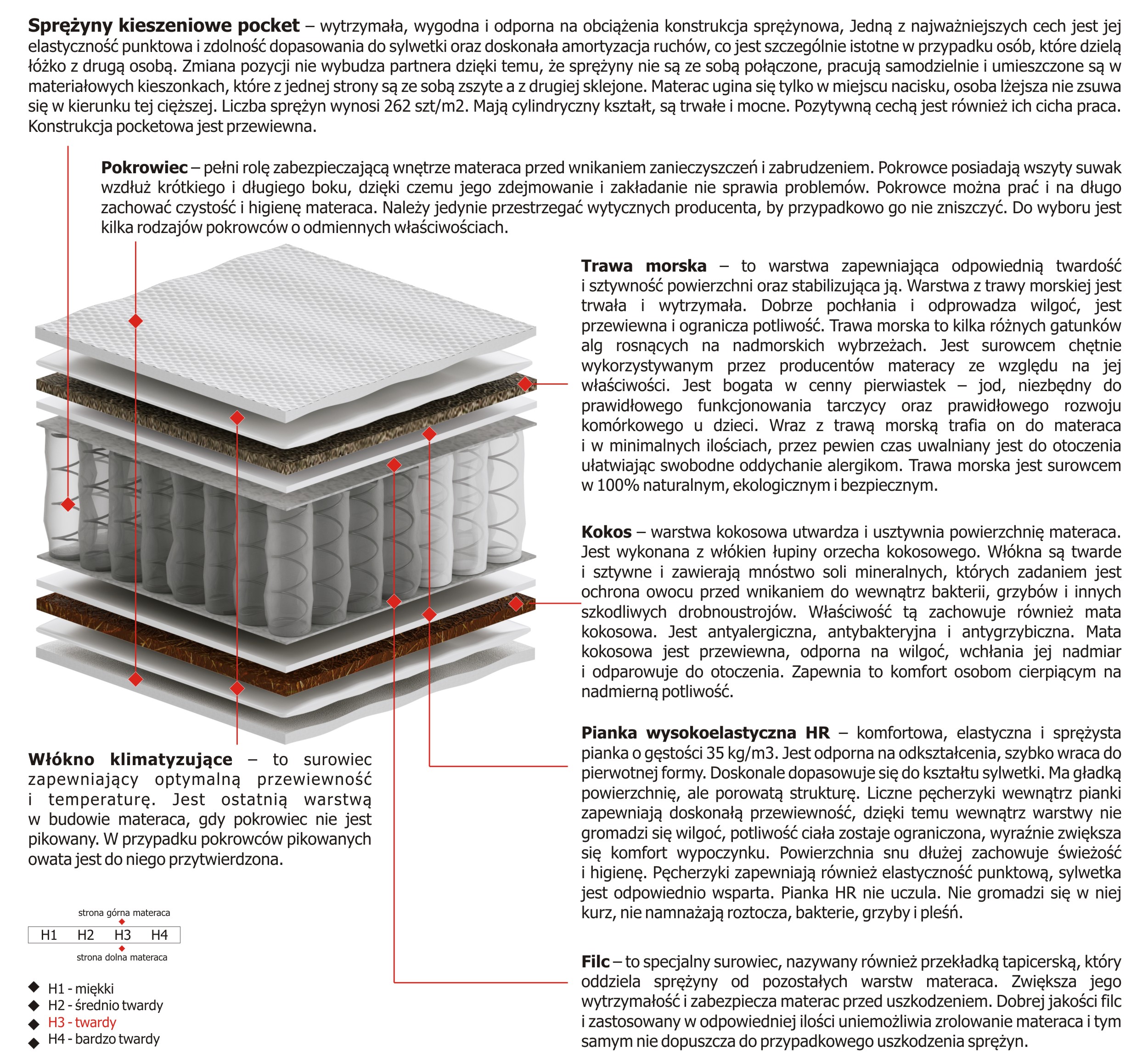 – wytrzymała, wygodna i odporna na obciążenia konstrukcja sprężynowa, Jedną z najważniejszych cech jest jej elastyczność punktowa i zdolność dopasowania do sylwetki oraz doskonała amortyzacja ruchów, co jest szczególnie istotne w przypadku osób, które dzielą łóżko z drugą osobą. Zmiana pozycji nie wybudza partnera dzięki temu, że sprężyny nie są ze sobą połączone, pracują samodzielnie i umieszczone są w materiałowych kieszonkach, które z jednej strony są ze sobą zszyte a z drugiej sklejone. Materac ugina się tylko w miejscu nacisku, osoba lżejsza nie zsuwa się w kierunku tej cięższej. Liczba sprężyn wynosi 262 szt/m2. Mają cylindryczny kształt, są trwałe i mocne. Pozytywną cechą jest również ich cicha praca. Konstrukcja pocketowa jest przewiewna.