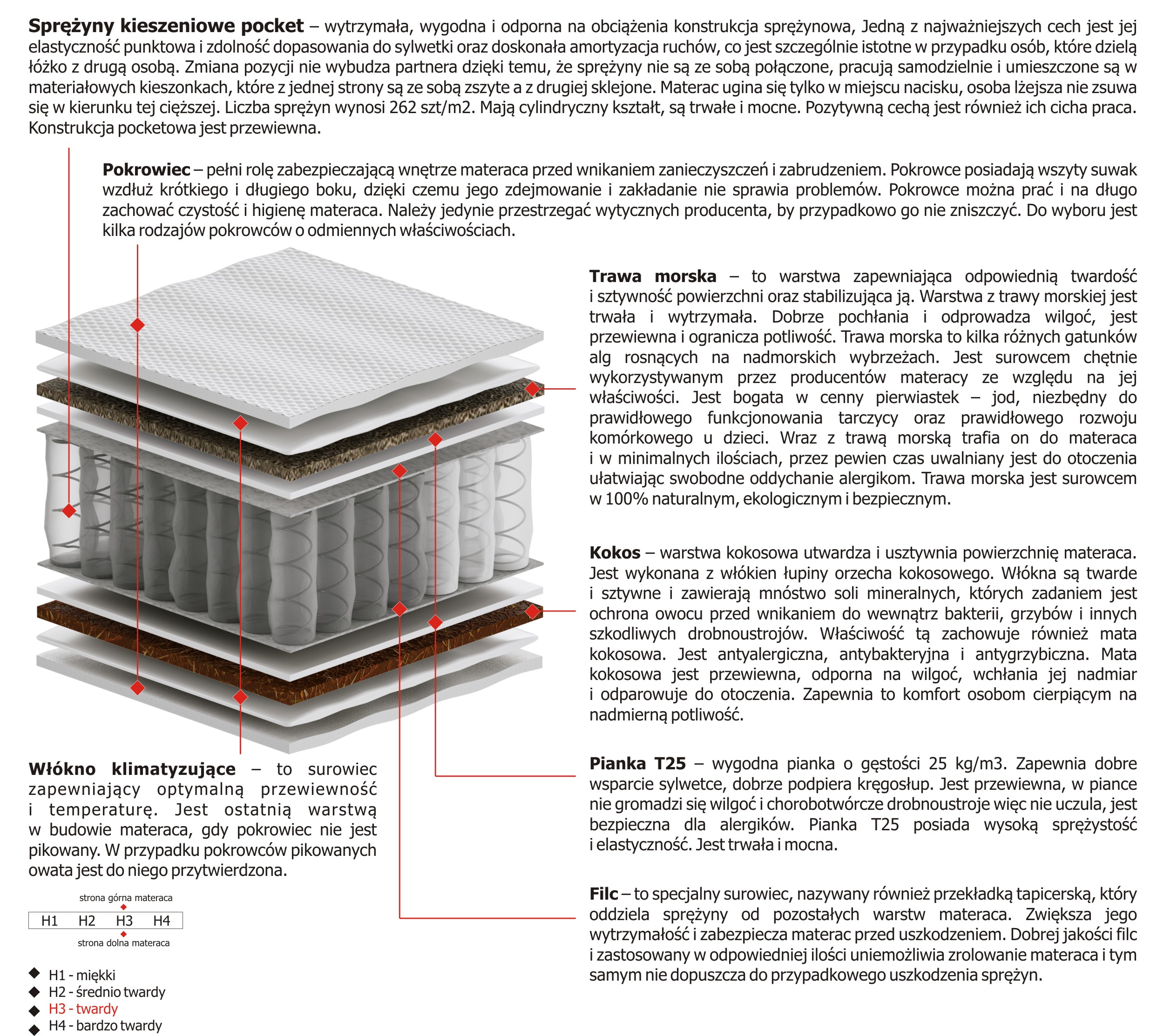 Budowa Sprezyny Pocketowe, Pianka Poliuretanowa T25, Pianka Wysokoelastyczna Hr, Kokos, Trawa Morska, Wlokno Klimatyzujace, Pokrowiec