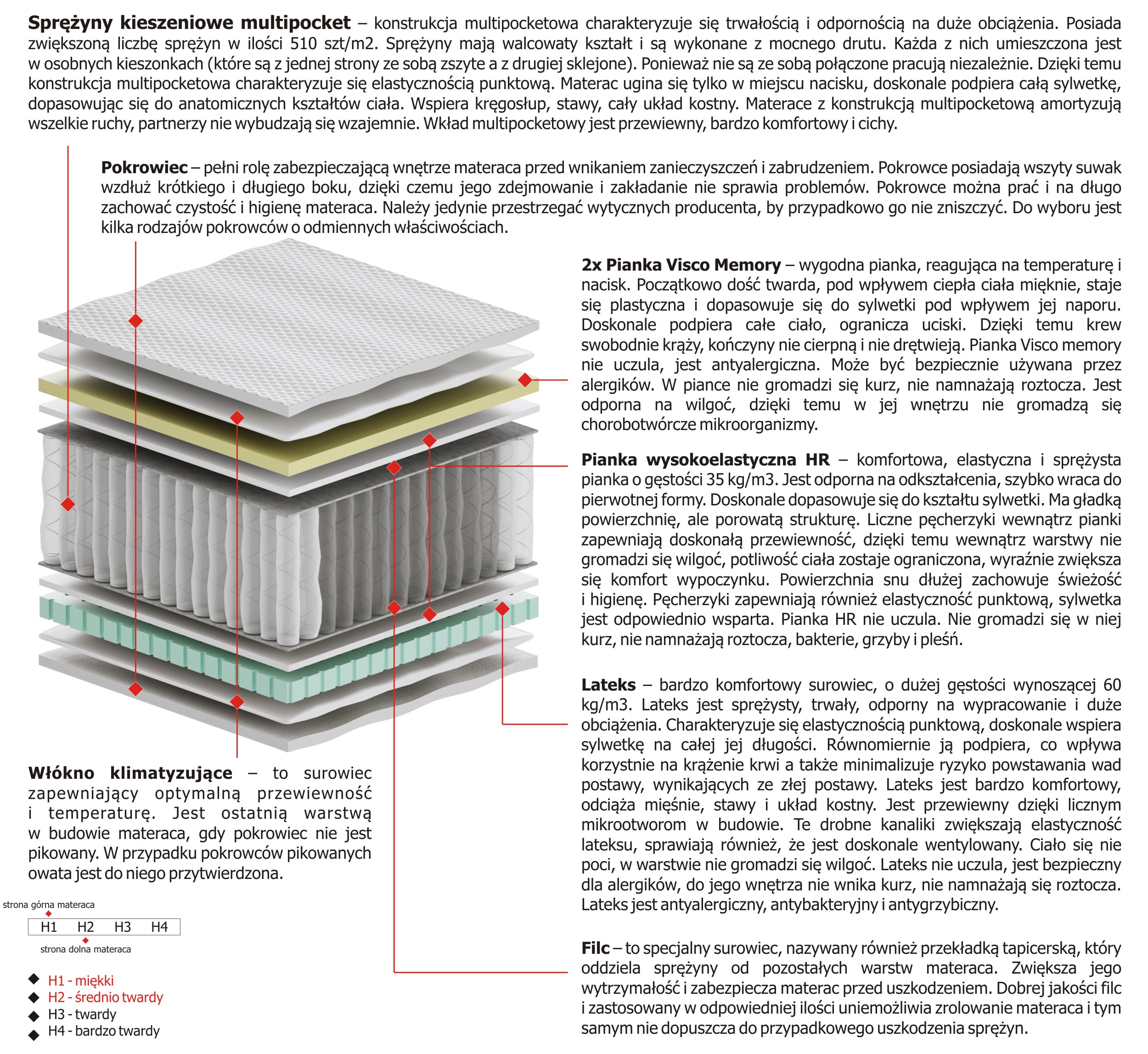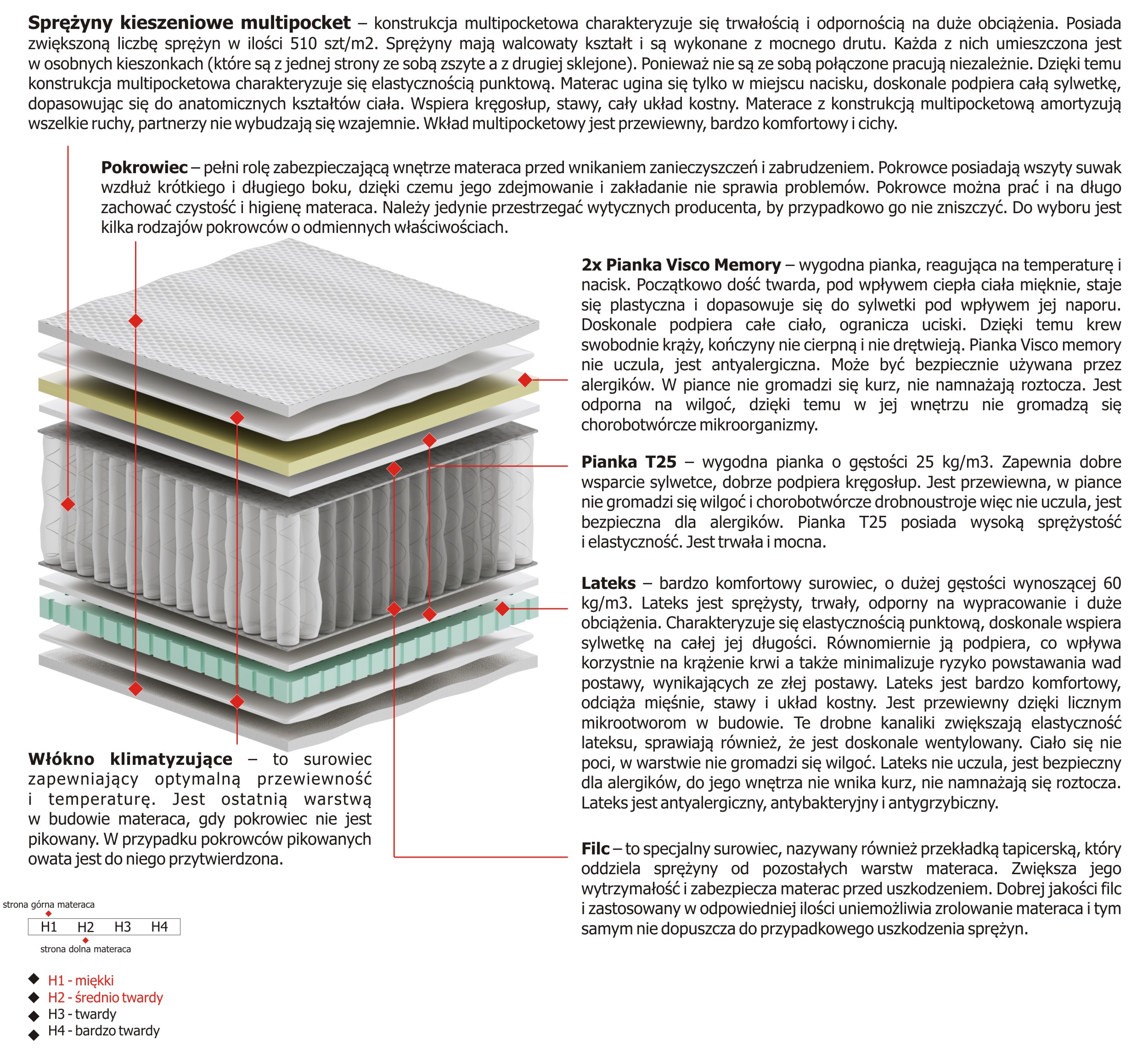 – konstrukcja multipocketowa charakteryzuje się trwałością i odpornością na duże obciążenia. Posiada zwiększoną liczbę sprężyn w ilości 510 szt/m2. Sprężyny mają walcowaty kształt i są wykonane z mocnego drutu. Każda z nich umieszczona jest w osobnych kieszonkach (które są z jednej strony ze sobą zszyte a z drugiej sklejone). Ponieważ nie są ze sobą połączone pracują niezależnie. Dzięki temu konstrukcja multipocketowa charakteryzuje się elastycznością punktową. Materac ugina się tylko w miejscu nacisku, doskonale podpiera całą sylwetkę, dopasowując się do anatomicznych kształtów ciała. Wspiera kręgosłup, stawy, cały układ kostny. Materace z konstrukcją multipocketową amortyzują wszelkie ruchy, partnerzy nie wybudzają się wzajemnie. Wkład multipocketowy jest przewiewny, bardzo komfortowy i cichy.