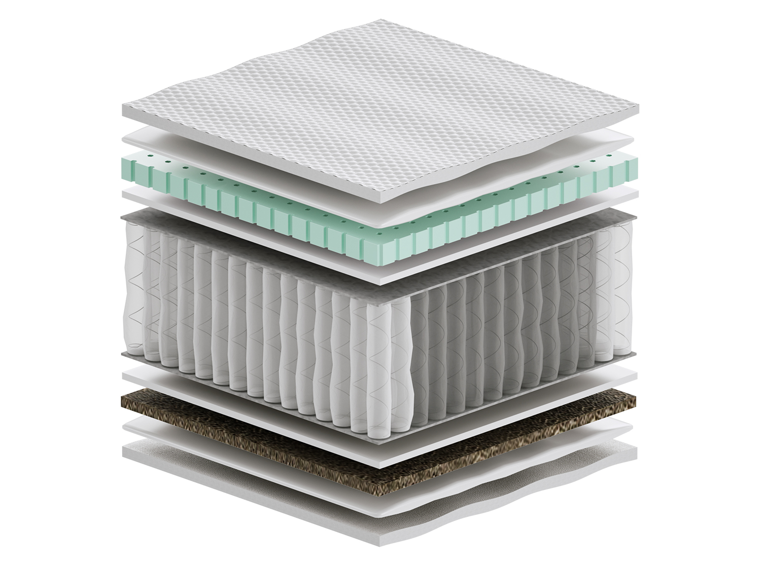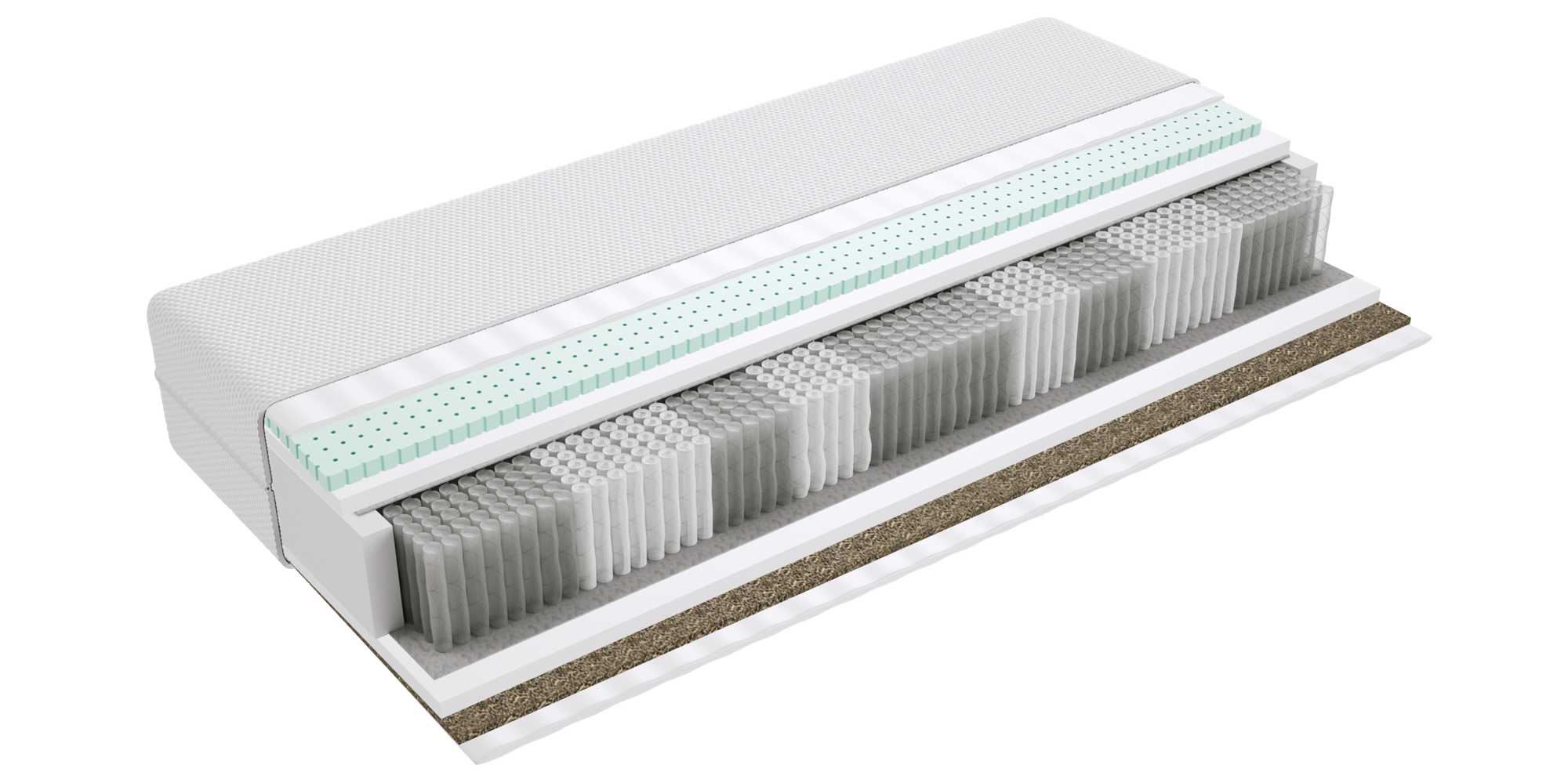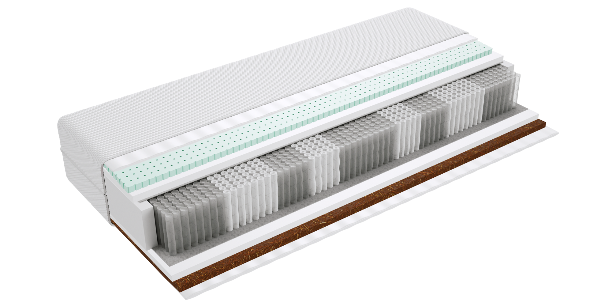 – warstwa kokosowa utwardza i usztywnia powierzchnię materaca. Jest wykonana z włókien łupiny orzecha kokosowego. Włókna są twarde i sztywne i zawierają mnóstwo soli mineralnych, których zadaniem jest ochrona owocu przed wnikaniem do wewnątrz bakterii, grzybów i innych szkodliwych drobnoustrojów. Właściwość tą zachowuje również mata kokosowa. Jest antyalergiczna, antybakteryjna i antygrzybiczna. Mata kokosowa jest przewiewna, odporna na wilgoć, wchłania jej nadmiar i odparowuje do otoczenia. Zapewnia to komfort osobom cierpiącym na nadmierną potliwość.