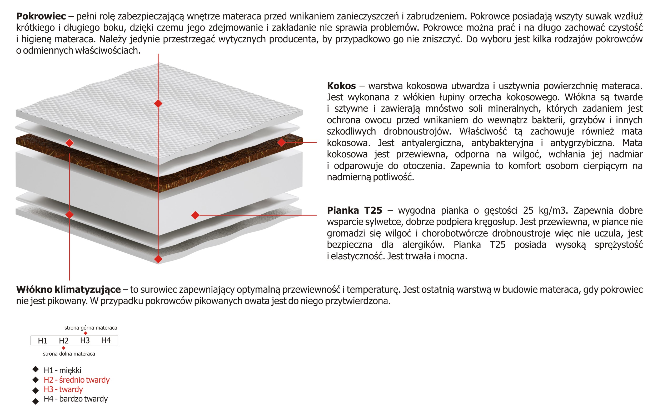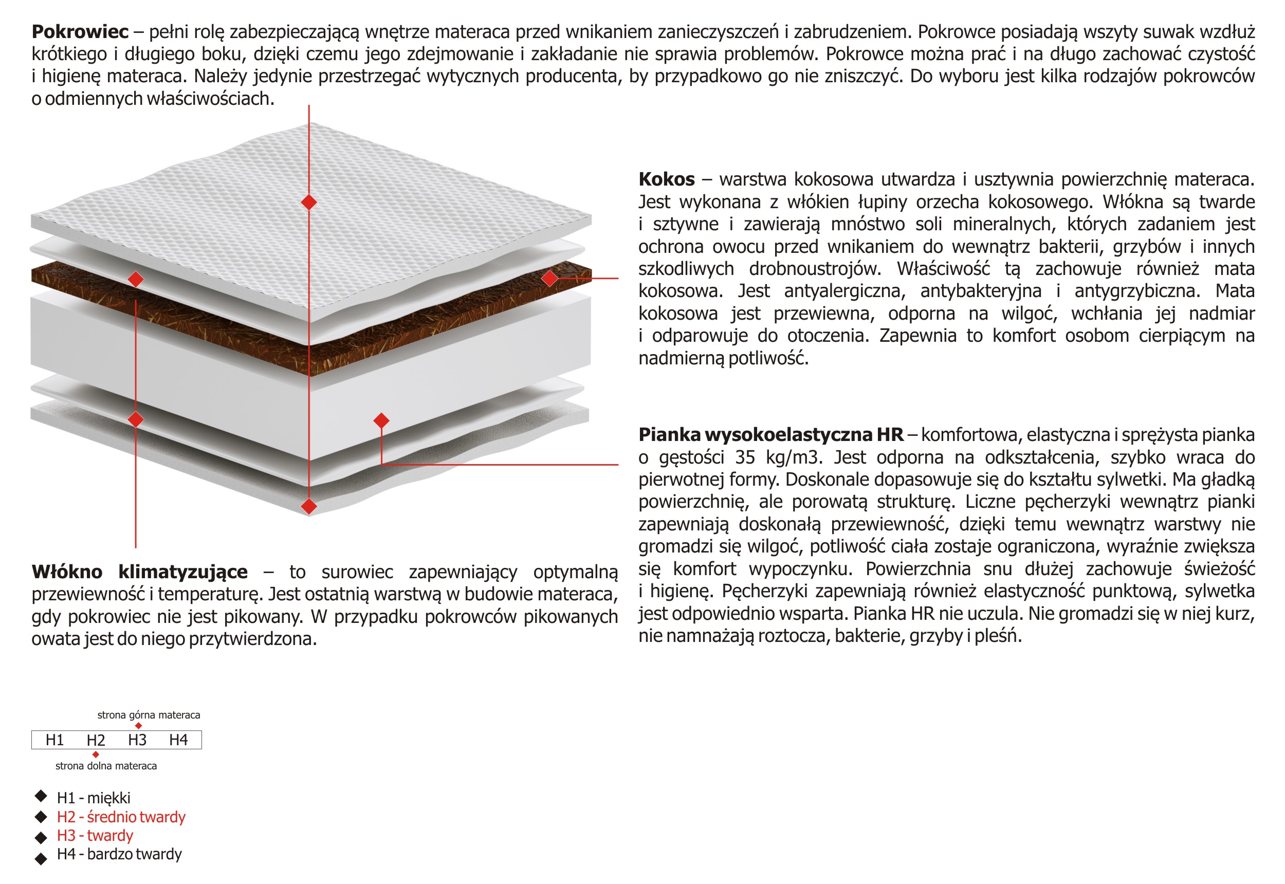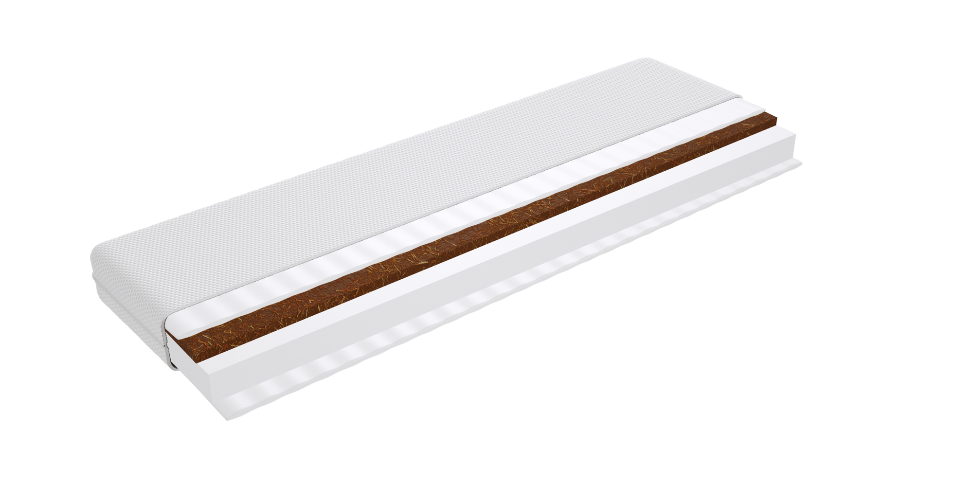 – warstwa kokosowa utwardza i usztywnia powierzchnię materaca. Jest wykonana z włókien łupiny orzecha kokosowego. Włókna są twarde i sztywne i zawierają mnóstwo soli mineralnych, których zadaniem jest ochrona owocu przed wnikaniem do wewnątrz bakterii, grzybów i innych szkodliwych drobnoustrojów. Właściwość tą zachowuje również mata kokosowa. Jest antyalergiczna, antybakteryjna i antygrzybiczna. Mata kokosowa jest przewiewna, odporna na wilgoć, wchłania jej nadmiar i odparowuje do otoczenia. Zapewnia to komfort osobom cierpiącym na nadmierną potliwość.