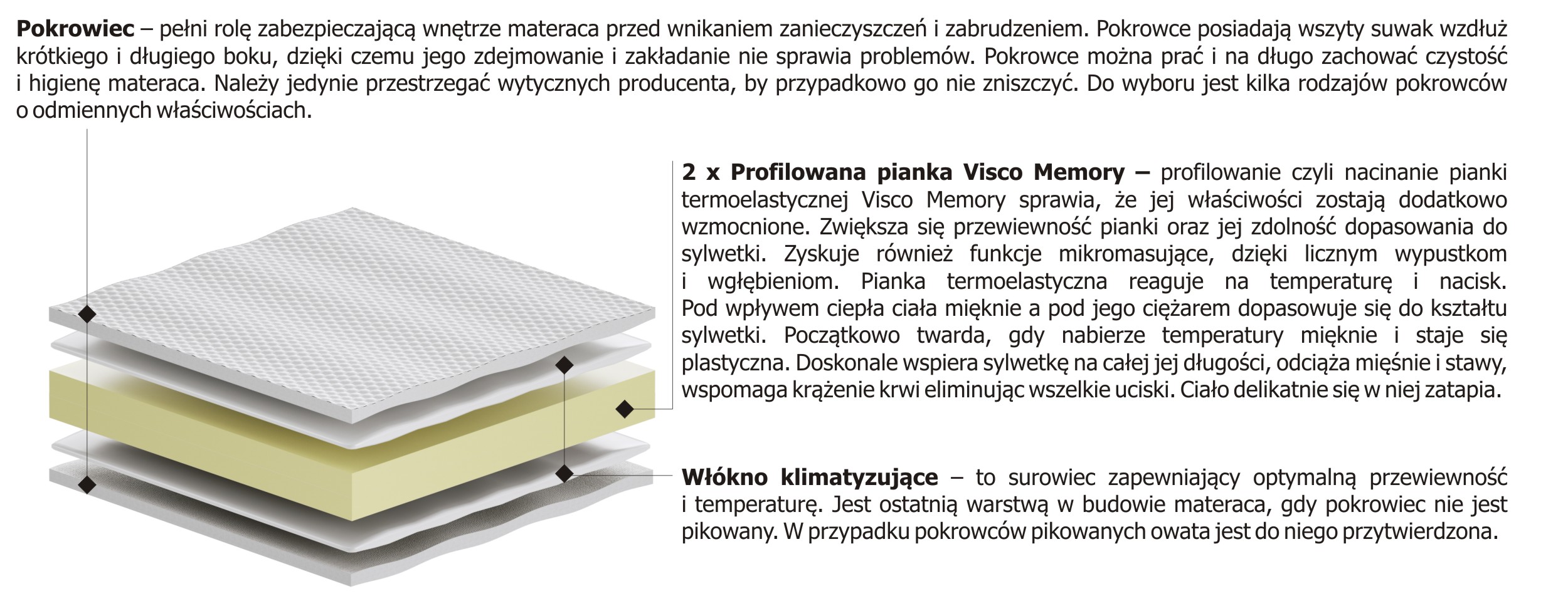 – wygodna pianka, reagująca na temperaturę i nacisk. Początkowo dość twarda, pod wpływem ciepła ciała mięknie, staje się plastyczna i dopasowuje się do sylwetki pod wpływem jej naporu. Doskonale podpiera całe ciało, ogranicza uciski. Dzięki temu krew swobodnie krąży, kończyny nie cierpną i nie drętwieją. Pianka Visco memory nie uczula, jest antyalergiczna. Może być bezpiecznie używana przez alergików. W piance nie gromadzi się kurz, nie namnażają roztocza. Jest odporna na wilgoć, dzięki temu w jej wnętrzu nie gromadzą się chorobotwórcze mikroorganizmy.