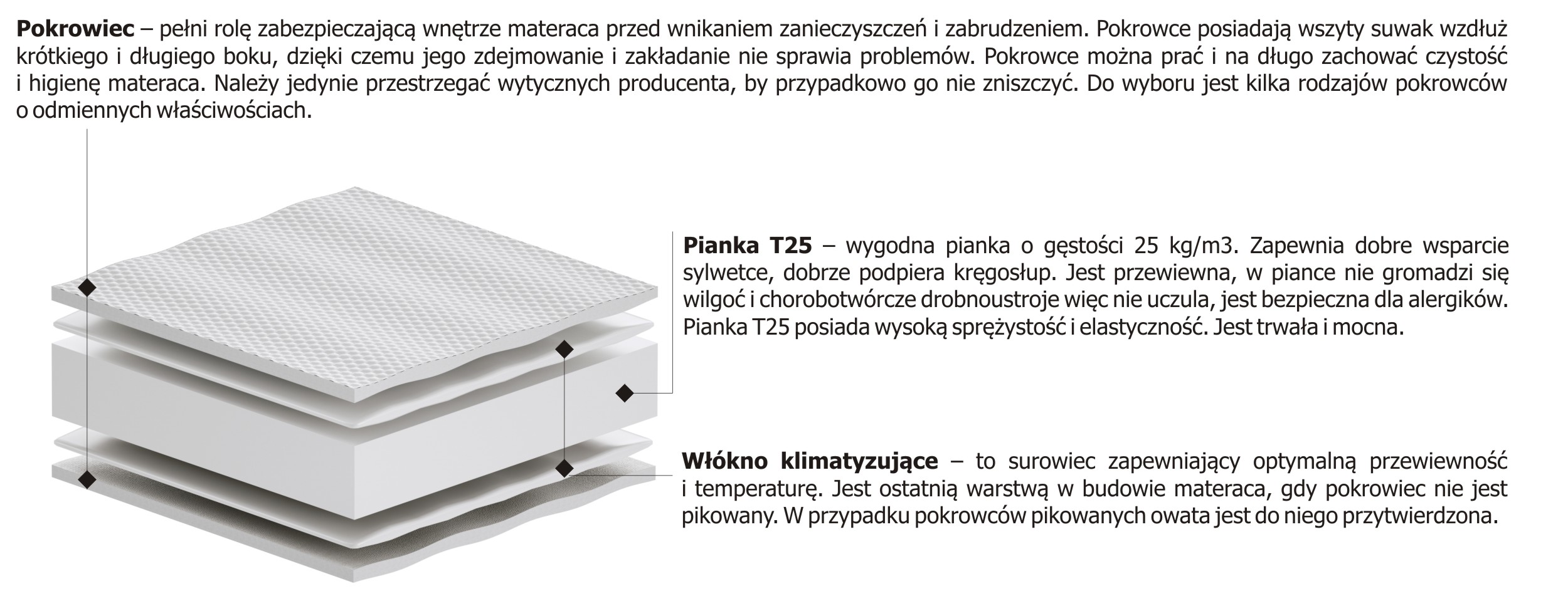 – wygodna pianka o gęstości 25 kg/m3. Zapewnia dobre wsparcie sylwetce, dobrze podpiera kręgosłup. Jest przewiewna, w piance nie gromadzi się wilgoć i chorobotwórcze drobnoustroje więc nie uczula, jest bezpieczna dla alergików. Pianka T25 posiada wysoką sprężystość i elastyczność. Jest trwała i mocna.