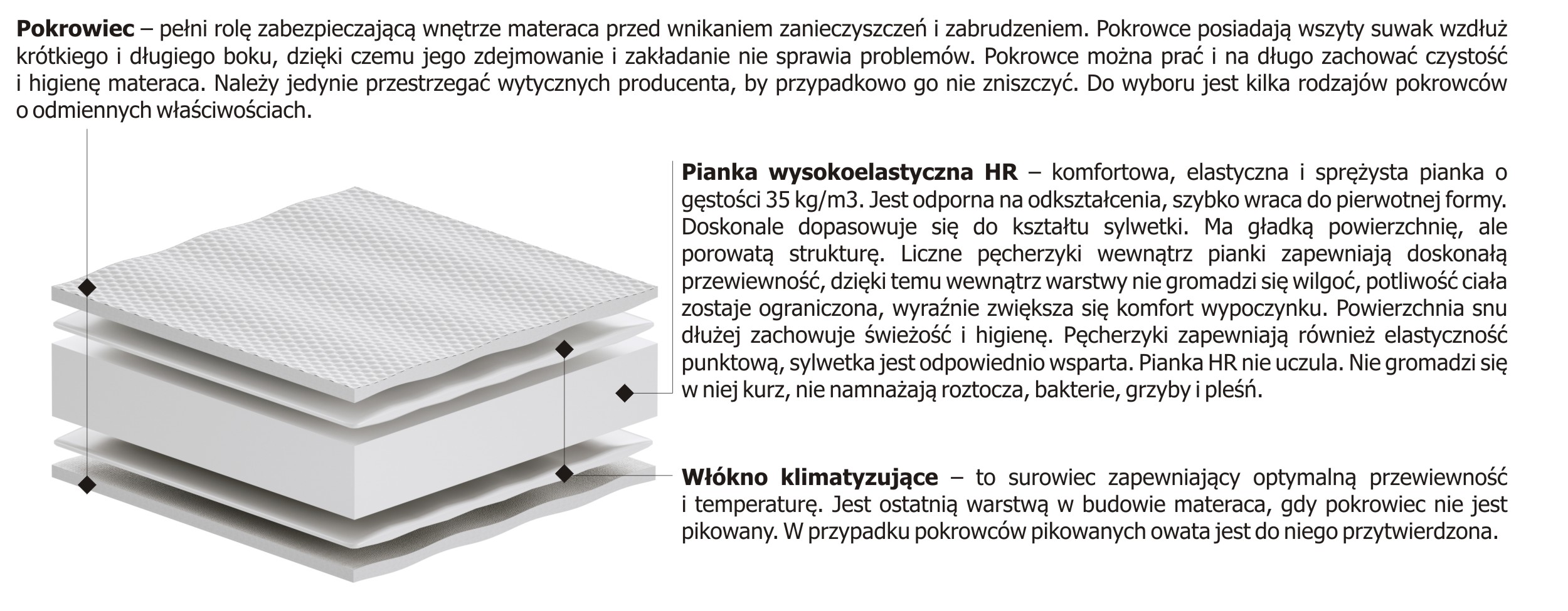 – komfortowa, elastyczna i sprężysta pianka o gęstości 35 kg/m3. Jest odporna na odkształcenia, szybko wraca do pierwotnej formy. Doskonale dopasowuje się do kształtu sylwetki. Ma gładką powierzchnię, ale porowatą strukturę. Liczne pęcherzyki wewnątrz pianki zapewniają doskonałą przewiewność, dzięki temu wewnątrz warstwy nie gromadzi się wilgoć, potliwość ciała zostaje ograniczona, wyraźnie zwiększa się komfort wypoczynku. Powierzchnia snu dłużej zachowuje świeżość i higienę. Pęcherzyki zapewniają również elastyczność punktową, sylwetka jest odpowiednio wsparta. Pianka HR nie uczula. Nie gromadzi się w niej kurz, nie namnażają roztocza, bakterie, grzyby i pleśń.