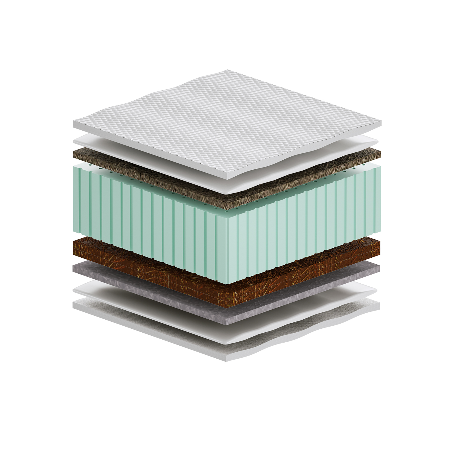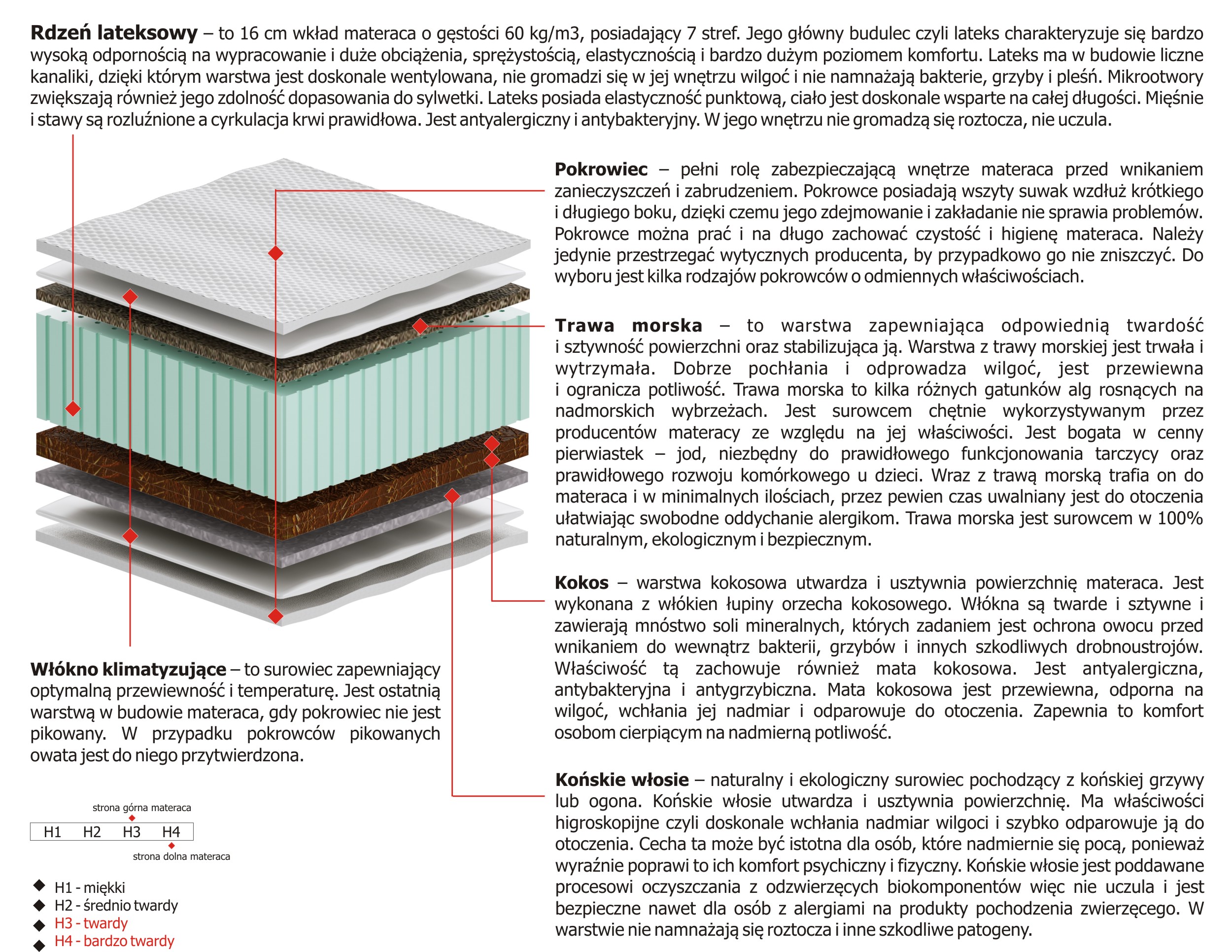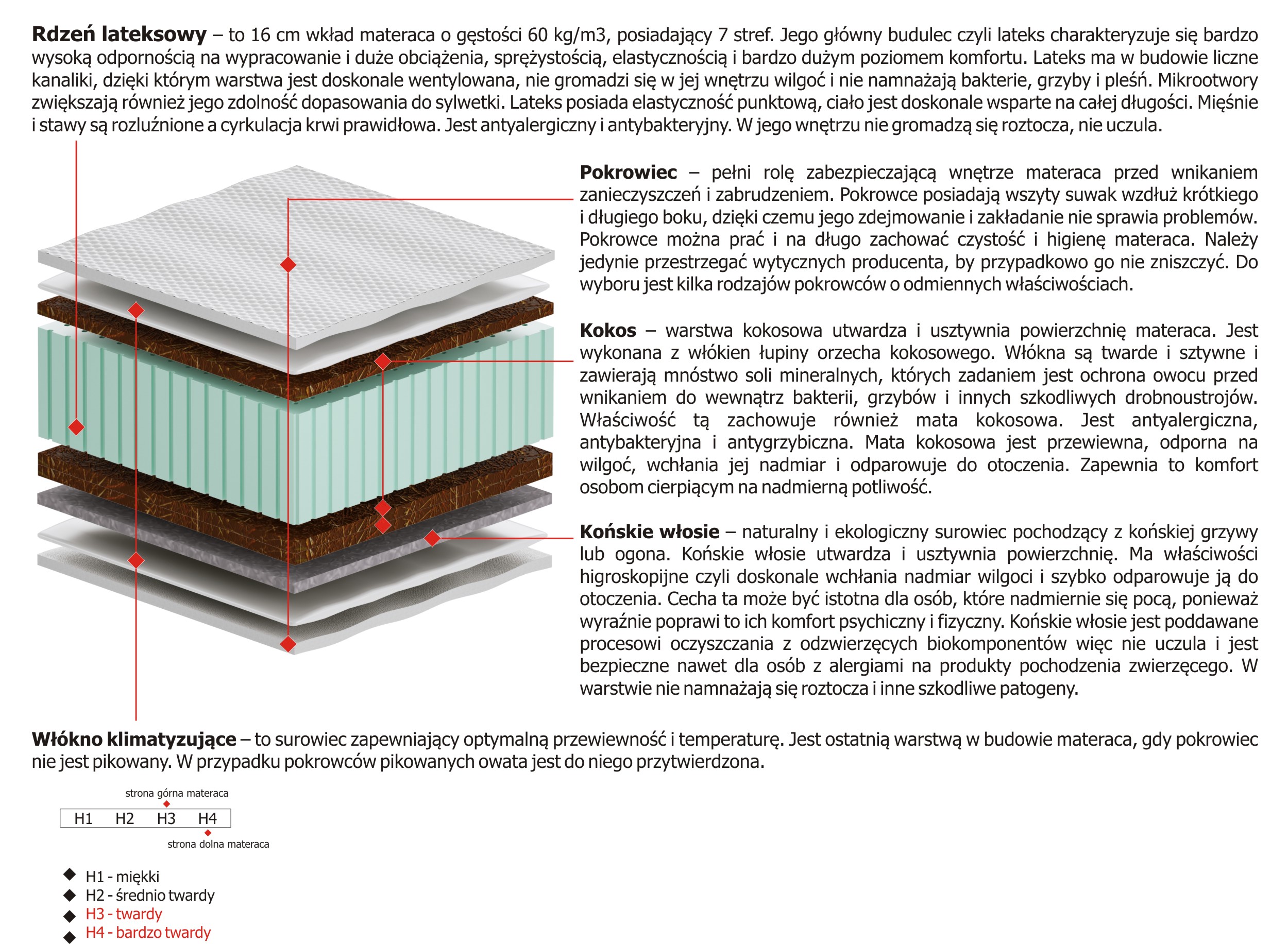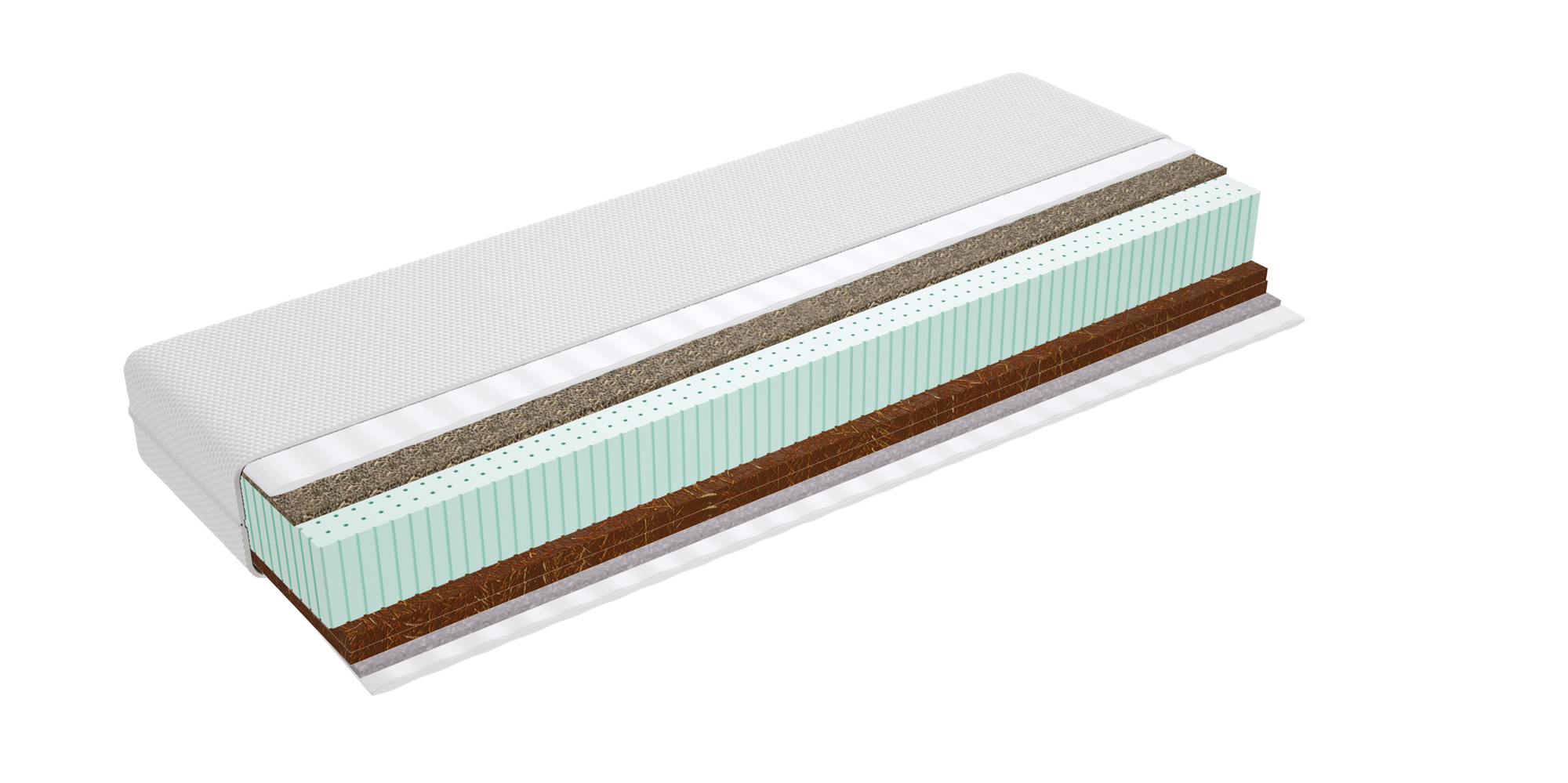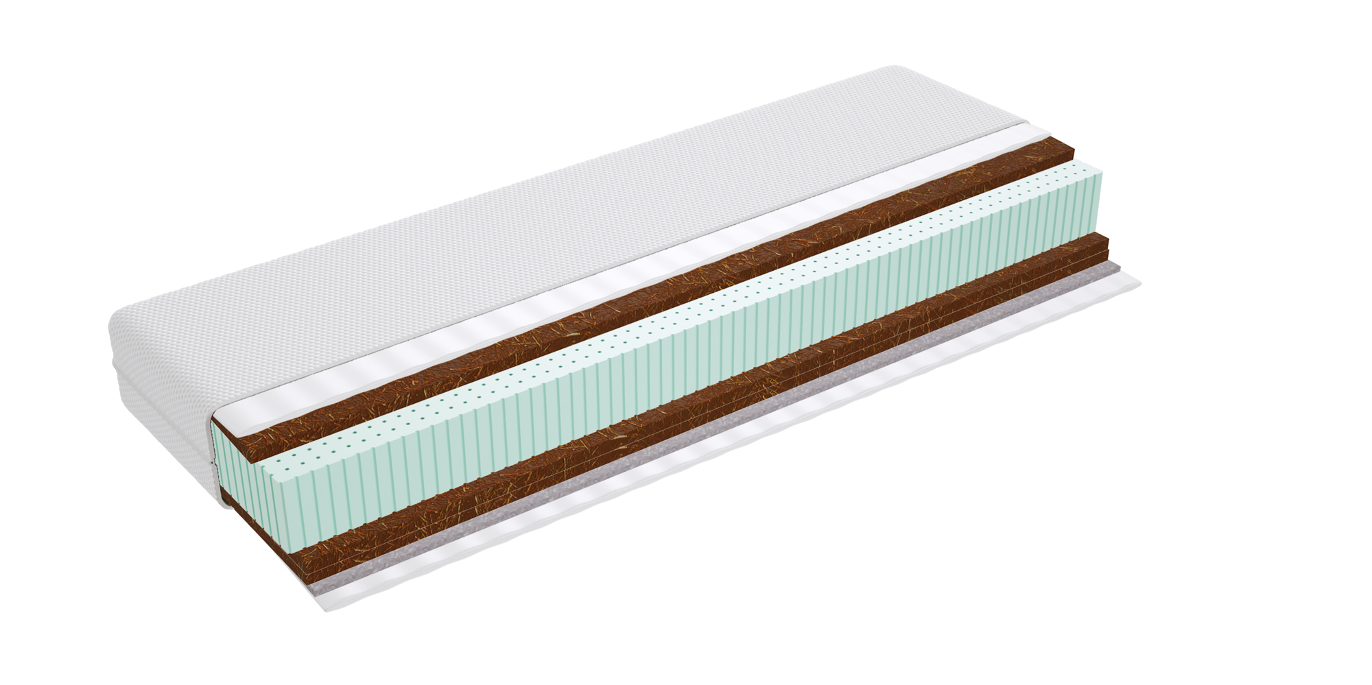 – warstwa kokosowa utwardza i usztywnia powierzchnię materaca. Jest wykonana z włókien łupiny orzecha kokosowego. Włókna są twarde i sztywne i zawierają mnóstwo soli mineralnych, których zadaniem jest ochrona owocu przed wnikaniem do wewnątrz bakterii, grzybów i innych szkodliwych drobnoustrojów. Właściwość tą zachowuje również mata kokosowa. Jest antyalergiczna, antybakteryjna i antygrzybiczna. Mata kokosowa jest przewiewna, odporna na wilgoć, wchłania jej nadmiar i odparowuje do otoczenia. Zapewnia to komfort osobom cierpiącym na nadmierną potliwość.