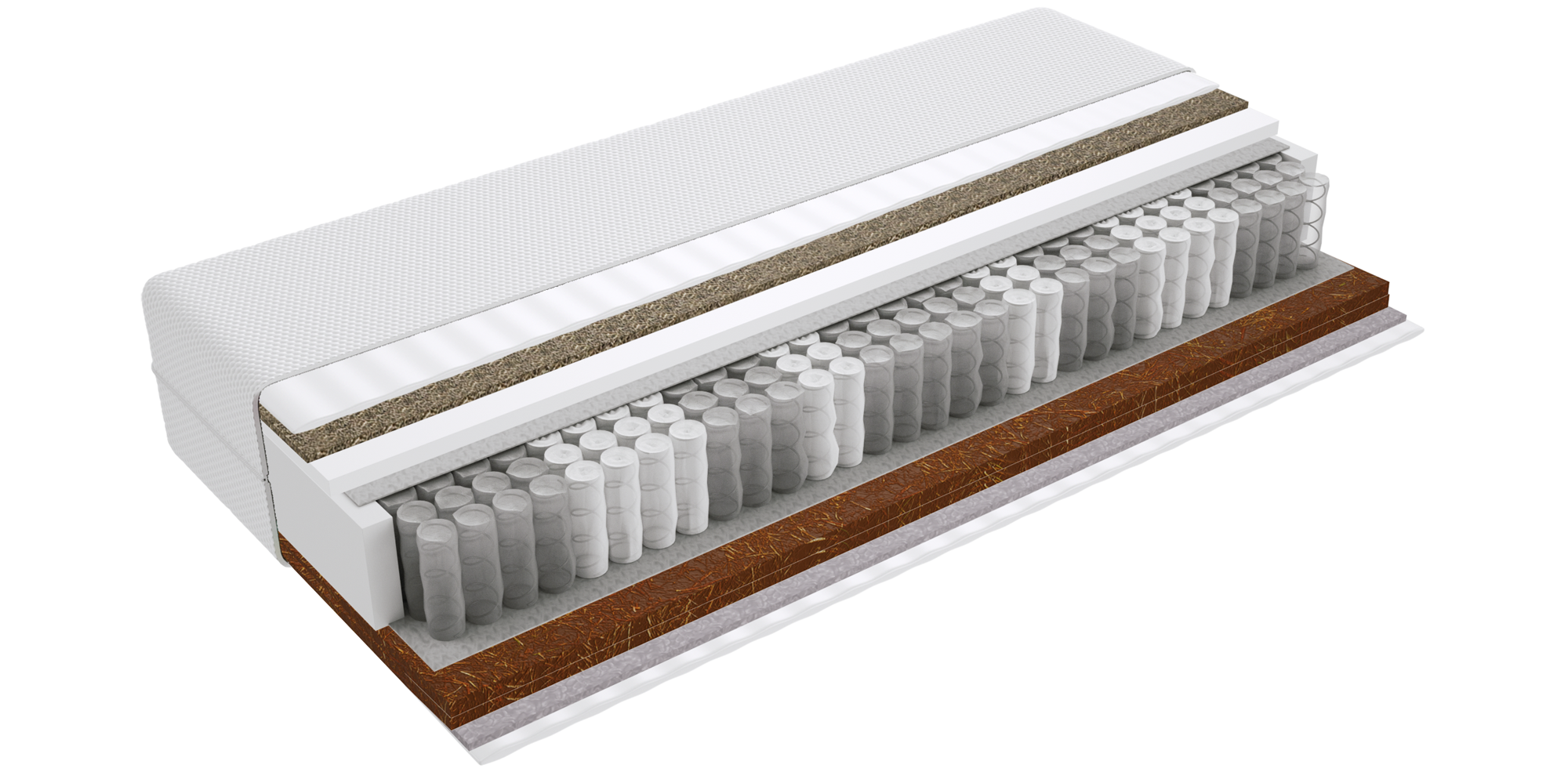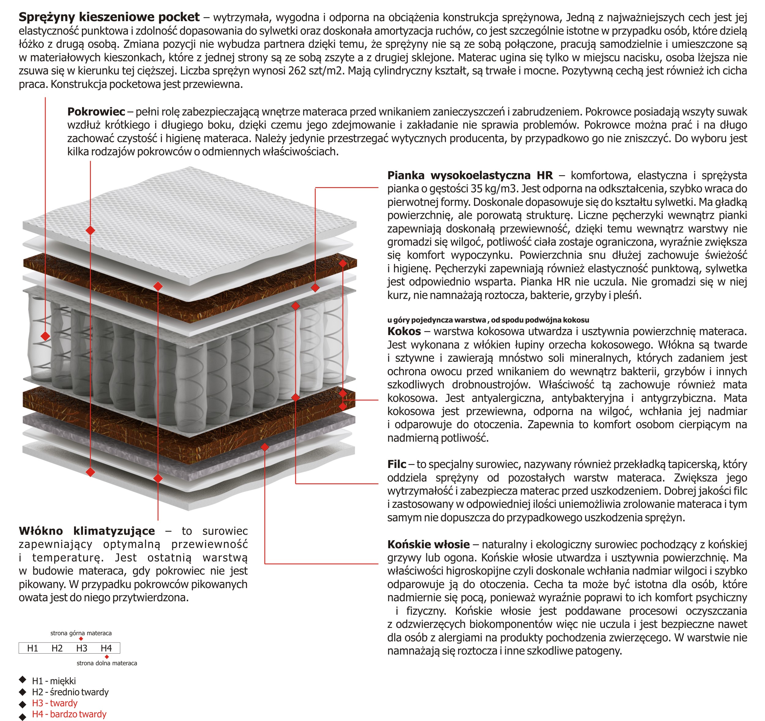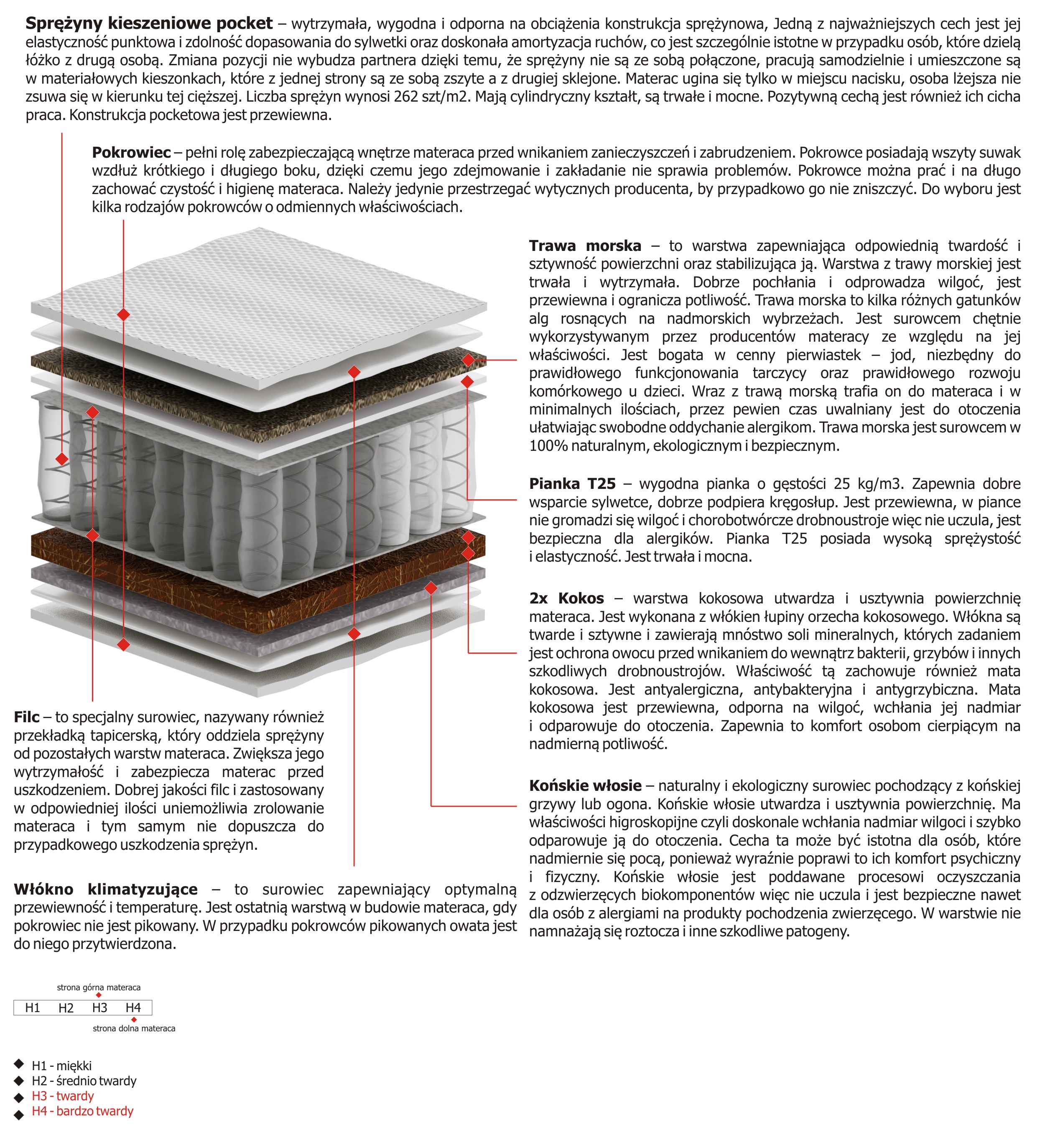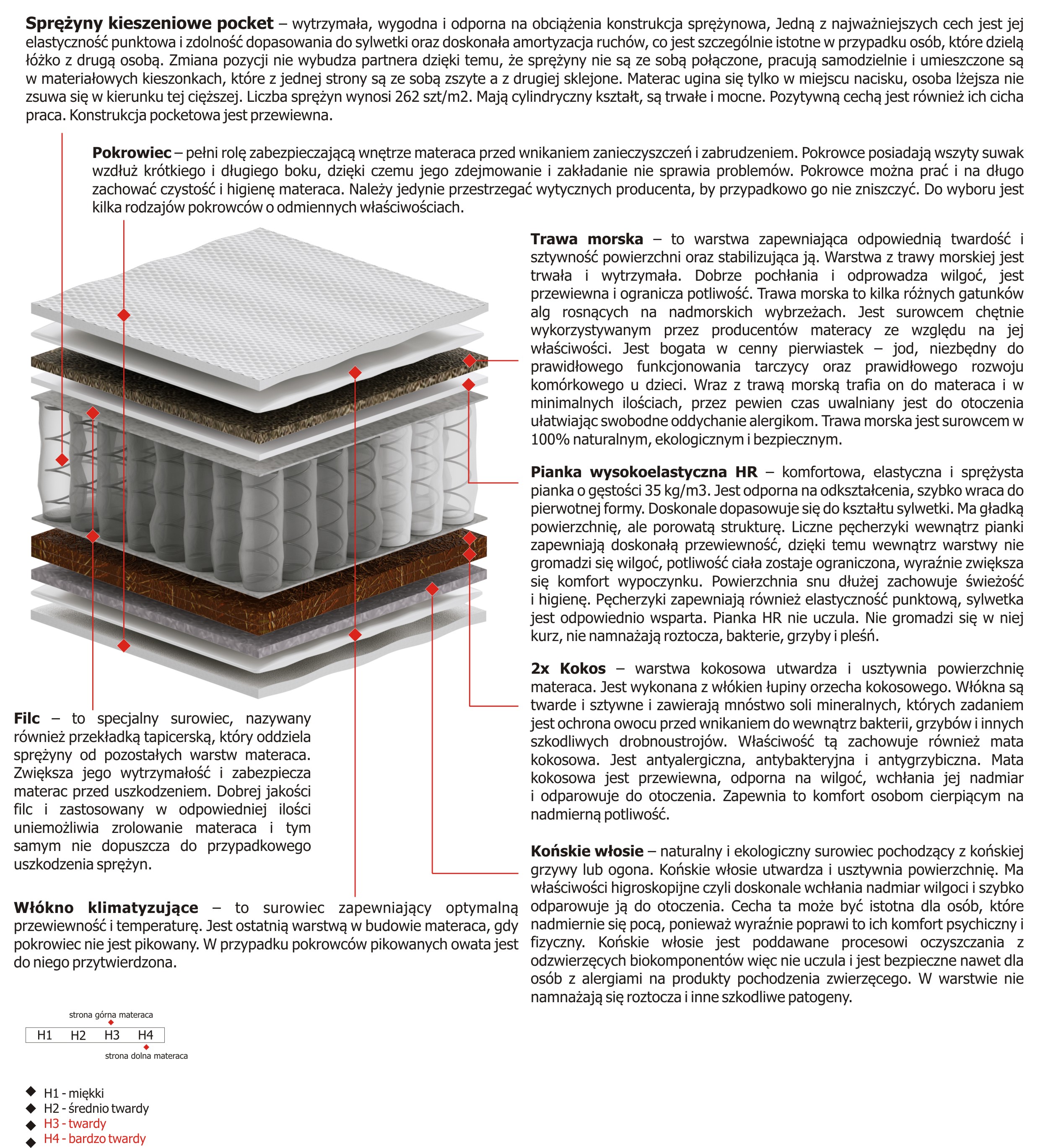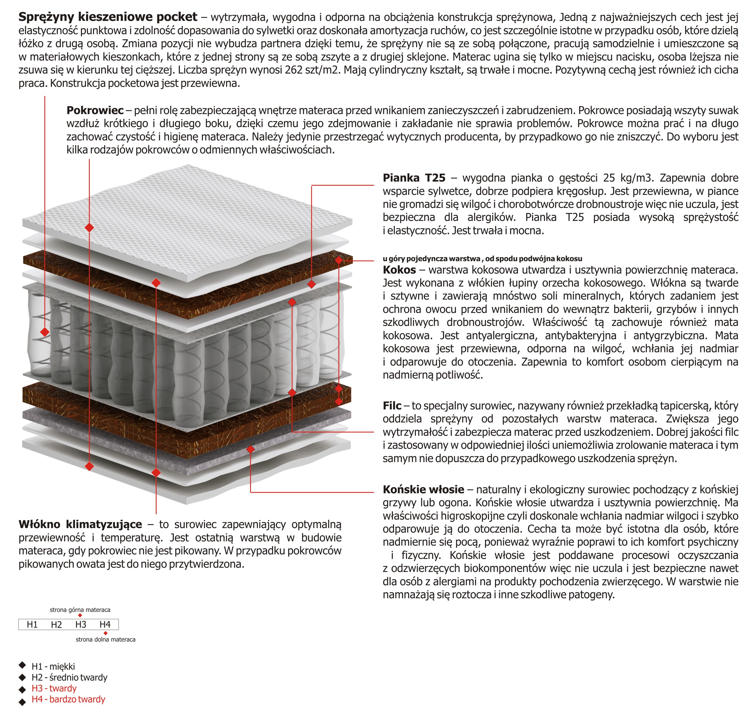 – wytrzymała, wygodna i odporna na obciążenia konstrukcja sprężynowa, Jedną z najważniejszych cech jest jej elastyczność punktowa i zdolność dopasowania do sylwetki oraz doskonała amortyzacja ruchów, co jest szczególnie istotne w przypadku osób, które dzielą łóżko z drugą osobą. Zmiana pozycji nie wybudza partnera dzięki temu, że sprężyny nie są ze sobą połączone, pracują samodzielnie i umieszczone są w materiałowych kieszonkach, które z jednej strony są ze sobą zszyte a z drugiej sklejone. Materac ugina się tylko w miejscu nacisku, osoba lżejsza nie zsuwa się w kierunku tej cięższej. Liczba sprężyn wynosi 262 szt/m2. Mają cylindryczny kształt, są trwałe i mocne. Pozytywną cechą jest również ich cicha praca. Konstrukcja pocketowa jest przewiewna.