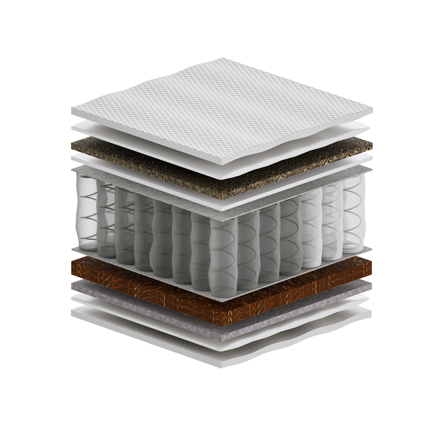 – warstwa kokosowa utwardza i usztywnia powierzchnię materaca. Jest wykonana z włókien łupiny orzecha kokosowego. Włókna są twarde i sztywne i zawierają mnóstwo soli mineralnych, których zadaniem jest ochrona owocu przed wnikaniem do wewnątrz bakterii, grzybów i innych szkodliwych drobnoustrojów. Właściwość tą zachowuje również mata kokosowa. Jest antyalergiczna, antybakteryjna i antygrzybiczna. Mata kokosowa jest przewiewna, odporna na wilgoć, wchłania jej nadmiar i odparowuje do otoczenia. Zapewnia to komfort osobom cierpiącym na nadmierną potliwość.
