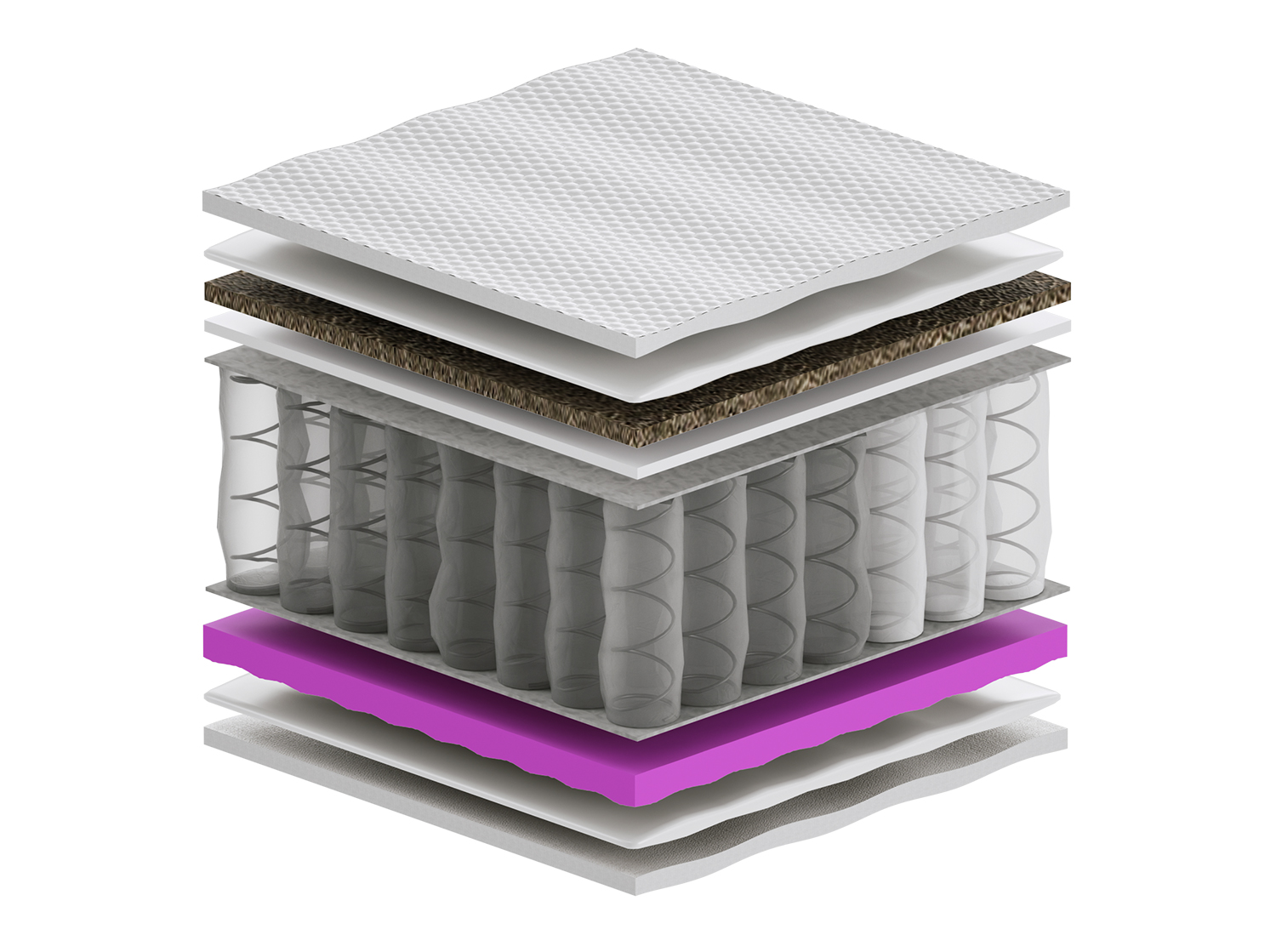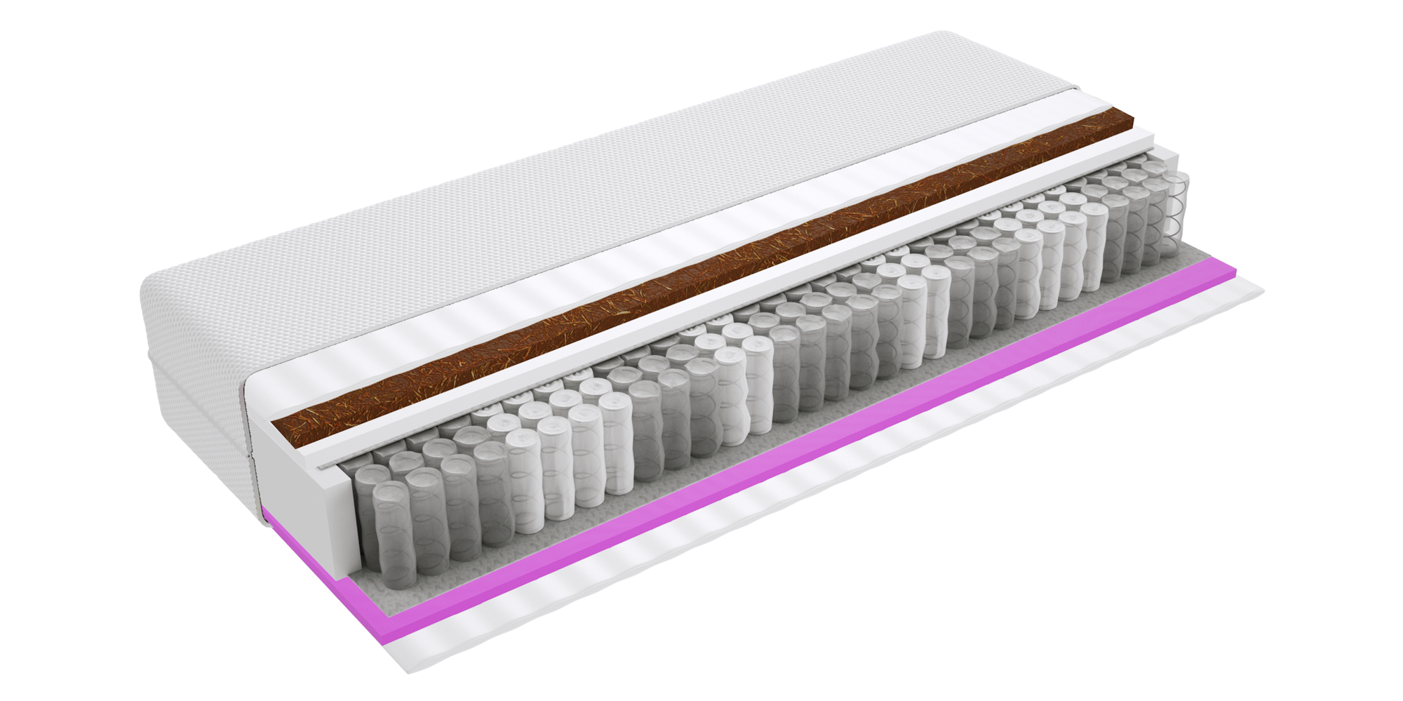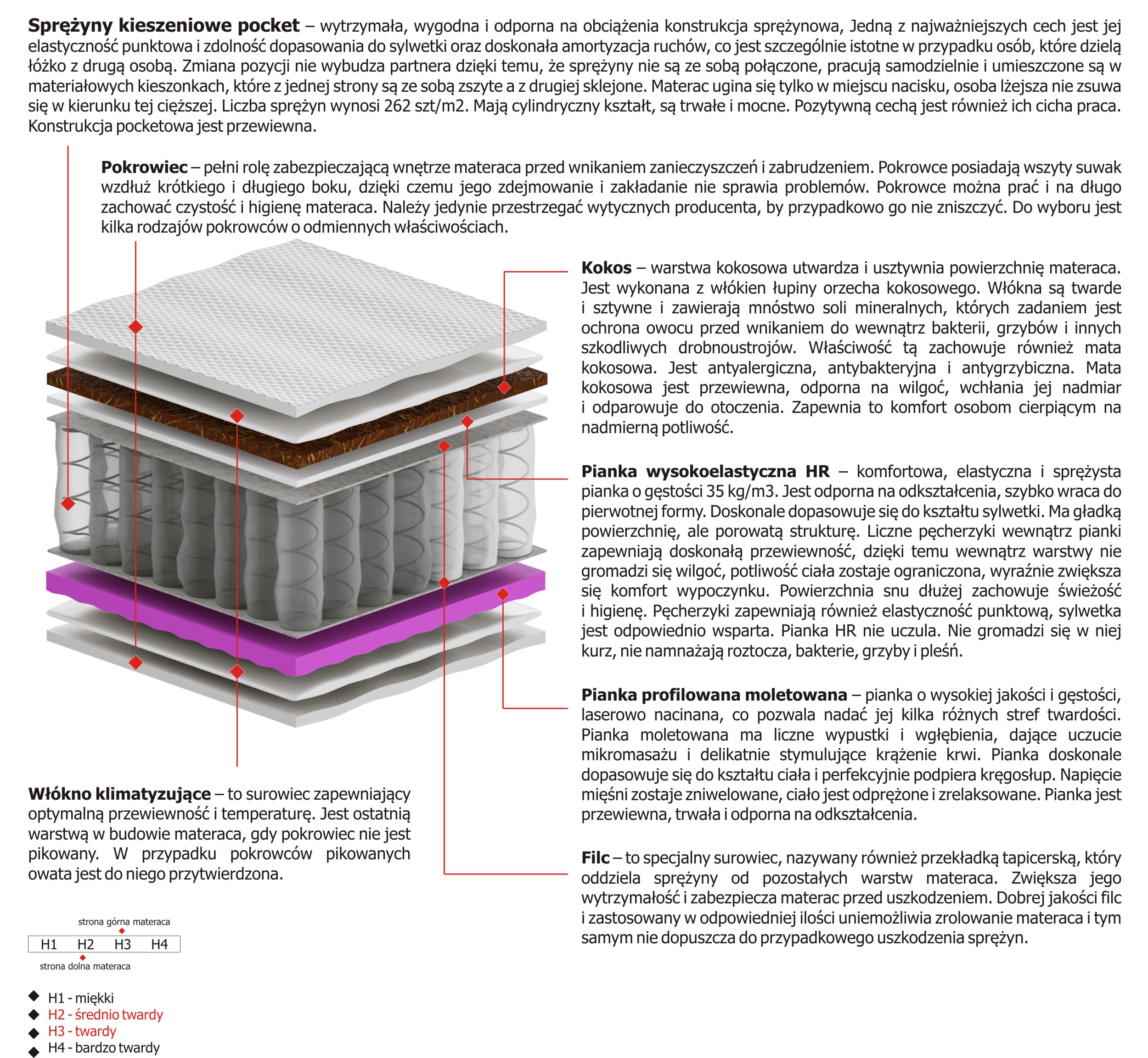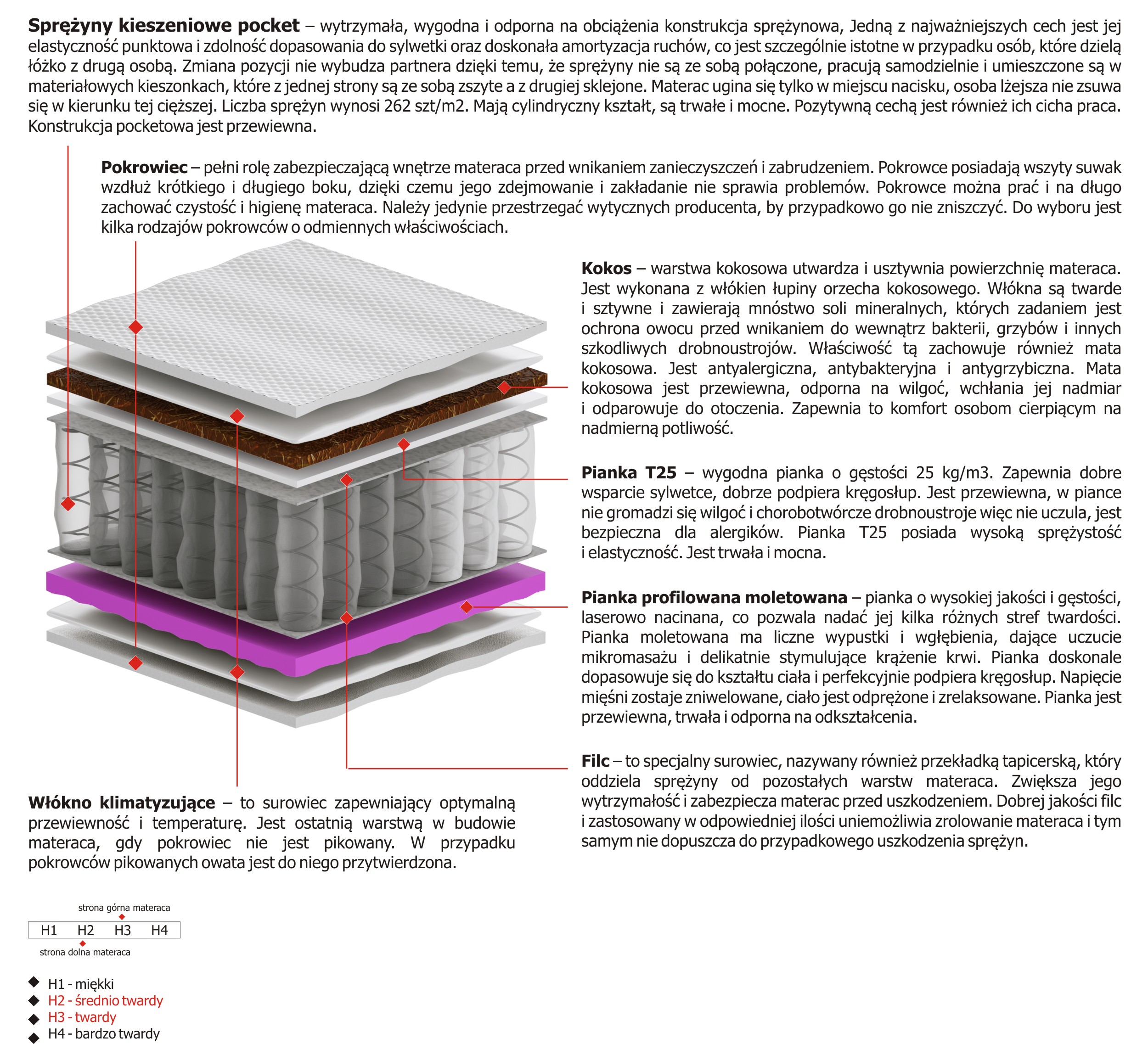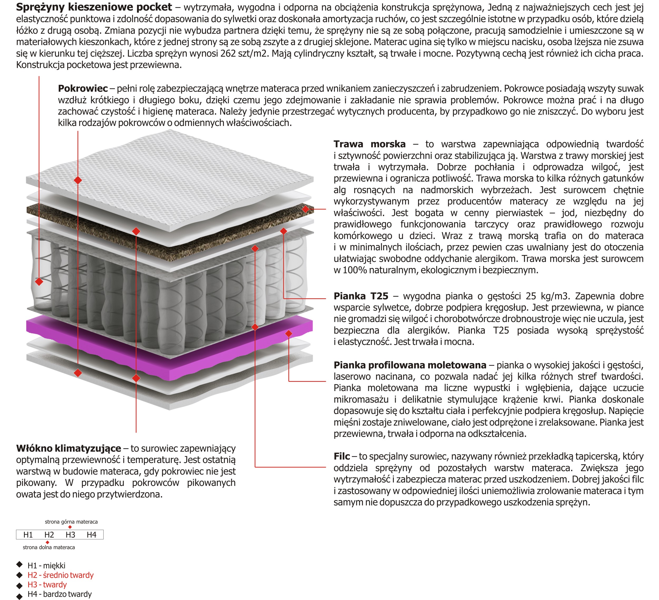 – wytrzymała, wygodna i odporna na obciążenia konstrukcja sprężynowa, Jedną z najważniejszych cech jest jej elastyczność punktowa i zdolność dopasowania do sylwetki oraz doskonała amortyzacja ruchów, co jest szczególnie istotne w przypadku osób, które dzielą łóżko z drugą osobą. Zmiana pozycji nie wybudza partnera dzięki temu, że sprężyny nie są ze sobą połączone, pracują samodzielnie i umieszczone są w materiałowych kieszonkach, które z jednej strony są ze sobą zszyte a z drugiej sklejone. Materac ugina się tylko w miejscu nacisku, osoba lżejsza nie zsuwa się w kierunku tej cięższej. Liczba sprężyn wynosi 262 szt/m2. Mają cylindryczny kształt, są trwałe i mocne. Pozytywną cechą jest również ich cicha praca. Konstrukcja pocketowa jest przewiewna.