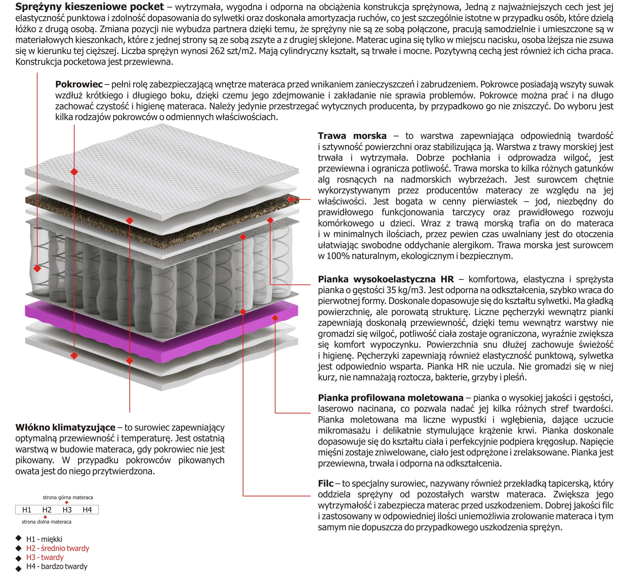 Budowa Sprezyny Pocketowe, Pianka Poliuretanowa T25, Pianka Wysokoelastyczna Hr, Pianka Moletowana Profilowana 3cm, Kokos, Trawa Morska, Wlokno Klimatyzujace, Pokrowiec
