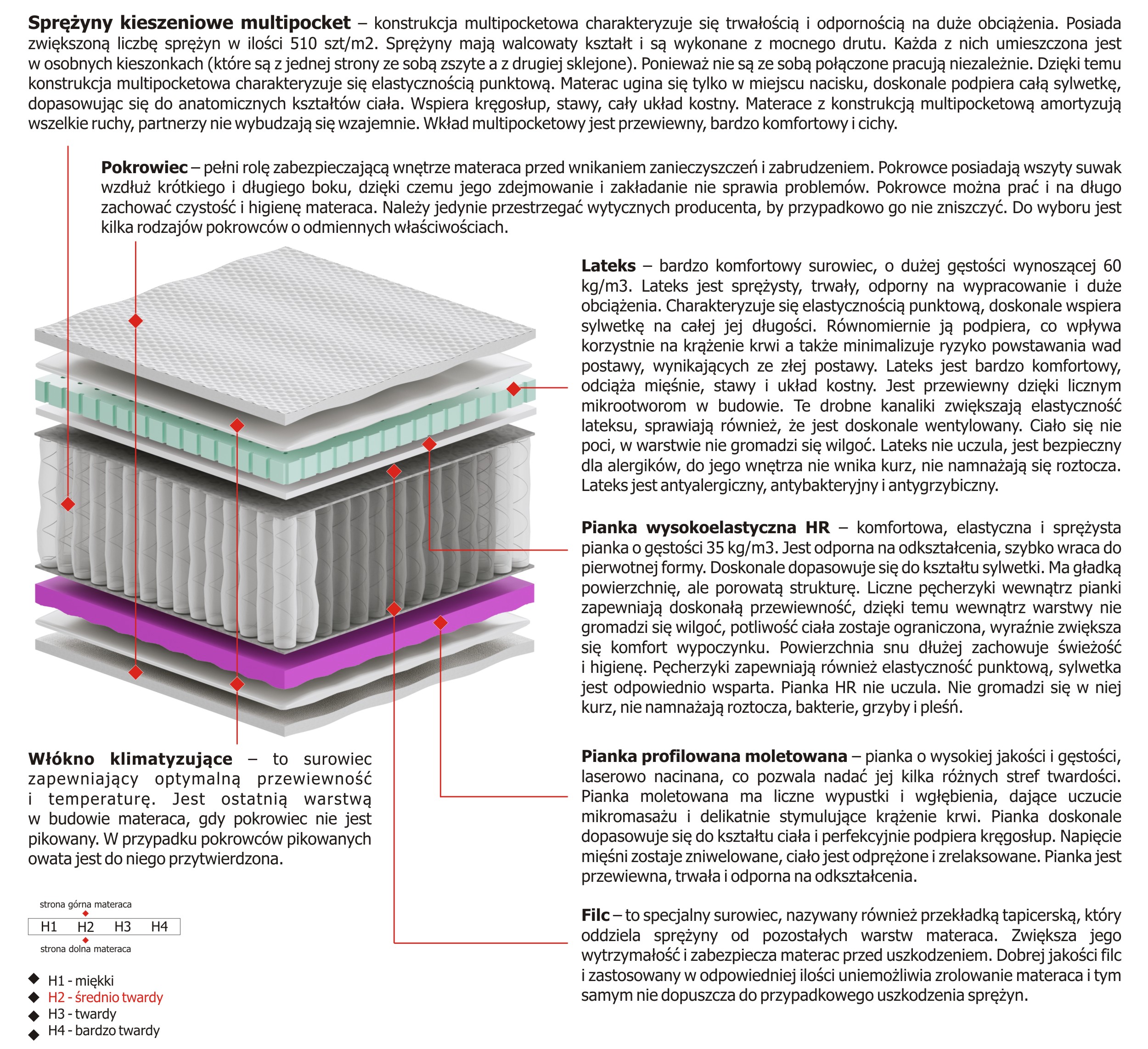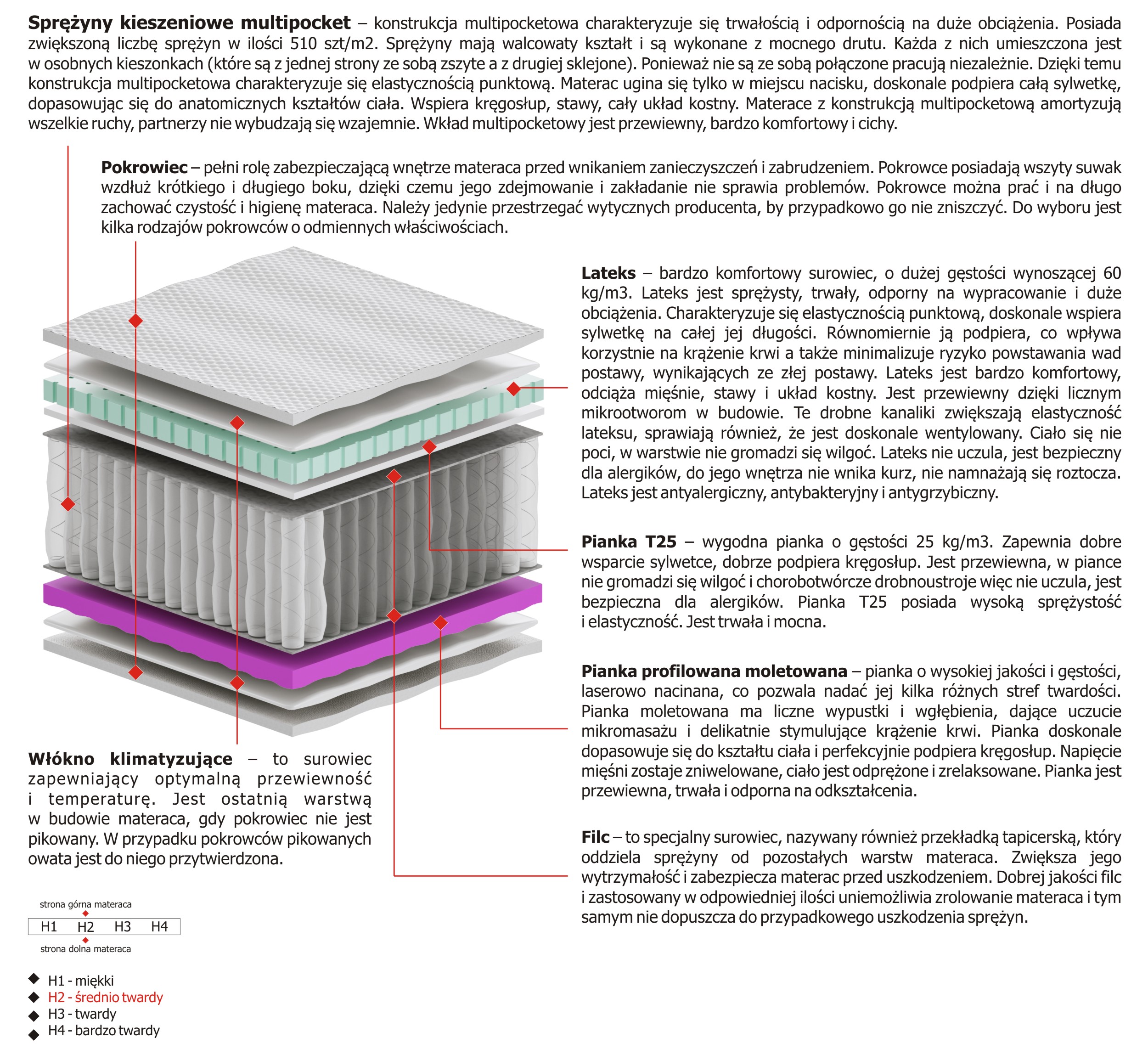 – konstrukcja multipocketowa charakteryzuje się trwałością i odpornością na duże obciążenia. Posiada zwiększoną liczbę sprężyn w ilości 510 szt/m2. Sprężyny mają walcowaty kształt i są wykonane z mocnego drutu. Każda z nich umieszczona jest w osobnych kieszonkach (które są z jednej strony ze sobą zszyte a z drugiej sklejone). Ponieważ nie są ze sobą połączone pracują niezależnie. Dzięki temu konstrukcja multipocketowa charakteryzuje się elastycznością punktową. Materac ugina się tylko w miejscu nacisku, doskonale podpiera całą sylwetkę, dopasowując się do anatomicznych kształtów ciała. Wspiera kręgosłup, stawy, cały układ kostny. Materace z konstrukcją multipocketową amortyzują wszelkie ruchy, partnerzy nie wybudzają się wzajemnie. Wkład multipocketowy jest przewiewny, bardzo komfortowy i cichy.