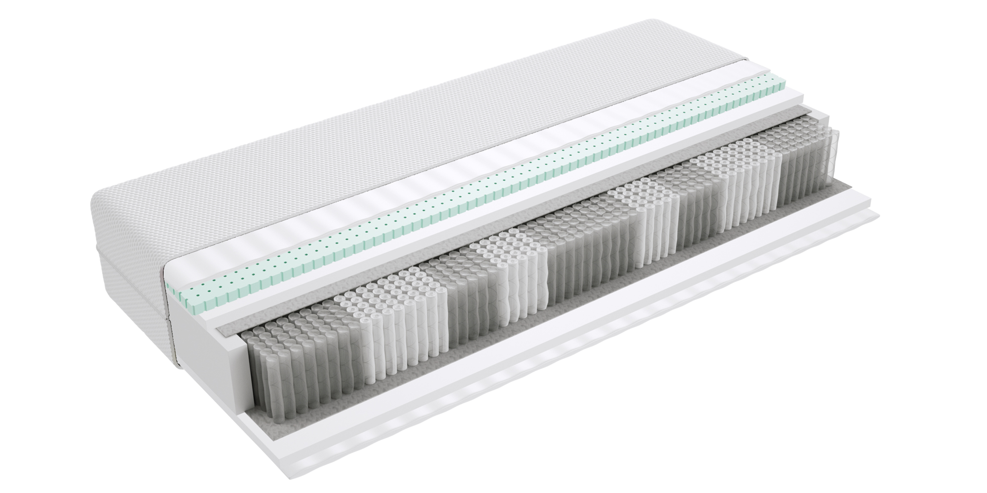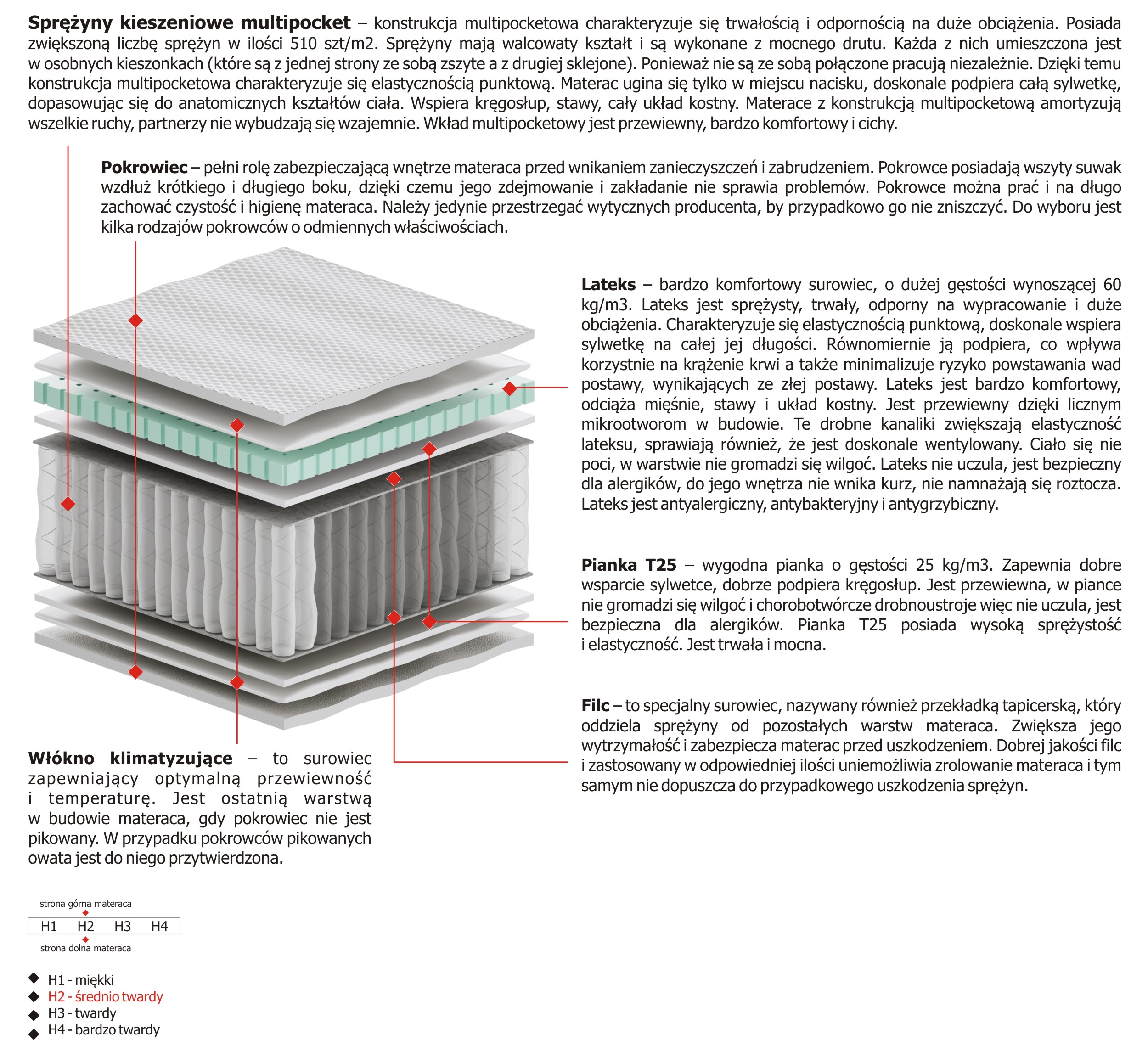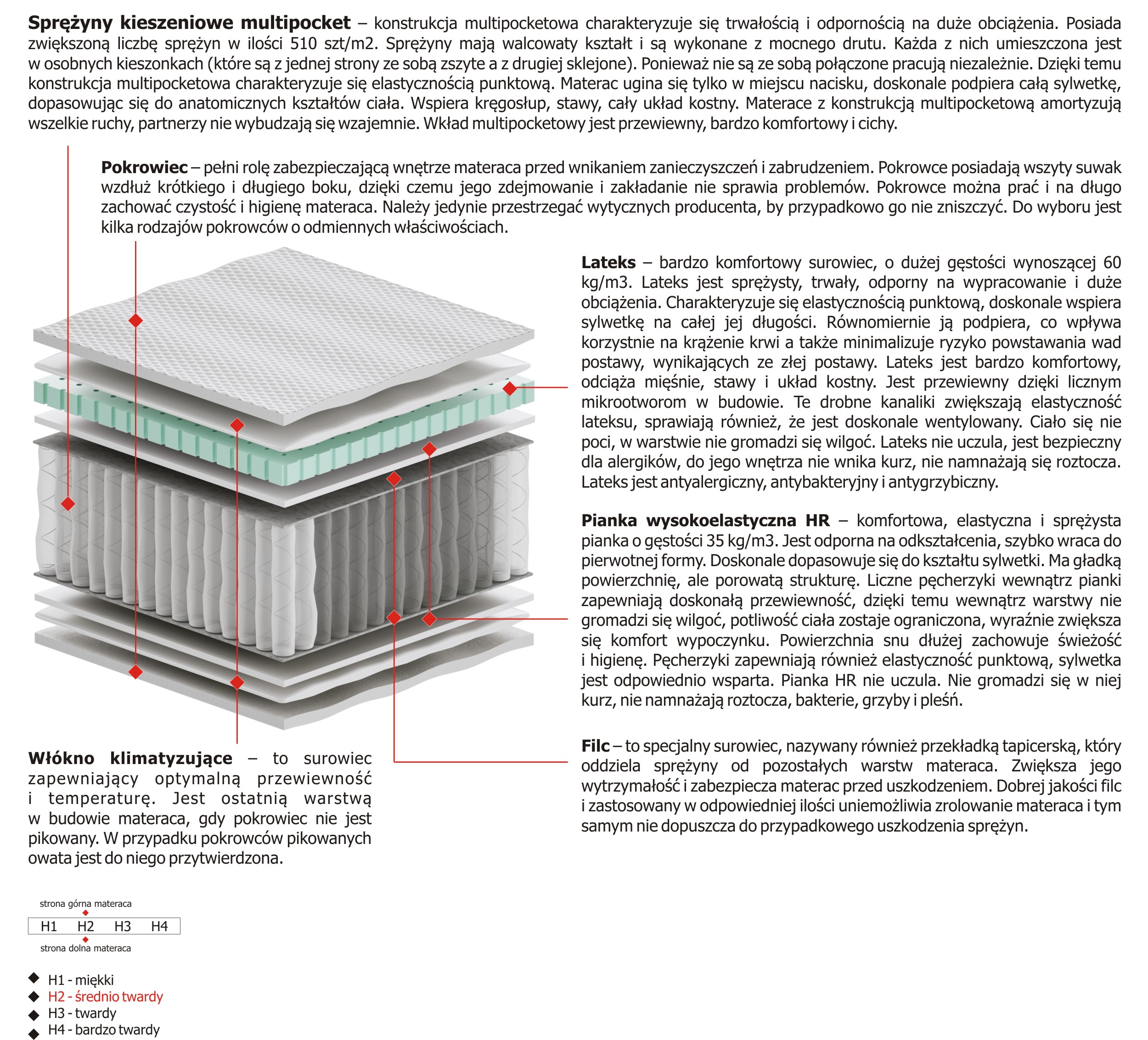 – konstrukcja multipocketowa charakteryzuje się trwałością i odpornością na duże obciążenia. Posiada zwiększoną liczbę sprężyn w ilości 510 szt/m2. Sprężyny mają walcowaty kształt i są wykonane z mocnego drutu. Każda z nich umieszczona jest w osobnych kieszonkach (które są z jednej strony ze sobą zszyte a z drugiej sklejone). Ponieważ nie są ze sobą połączone pracują niezależnie. Dzięki temu konstrukcja multipocketowa charakteryzuje się elastycznością punktową. Materac ugina się tylko w miejscu nacisku, doskonale podpiera całą sylwetkę, dopasowując się do anatomicznych kształtów ciała. Wspiera kręgosłup, stawy, cały układ kostny. Materace z konstrukcją multipocketową amortyzują wszelkie ruchy, partnerzy nie wybudzają się wzajemnie. Wkład multipocketowy jest przewiewny, bardzo komfortowy i cichy.